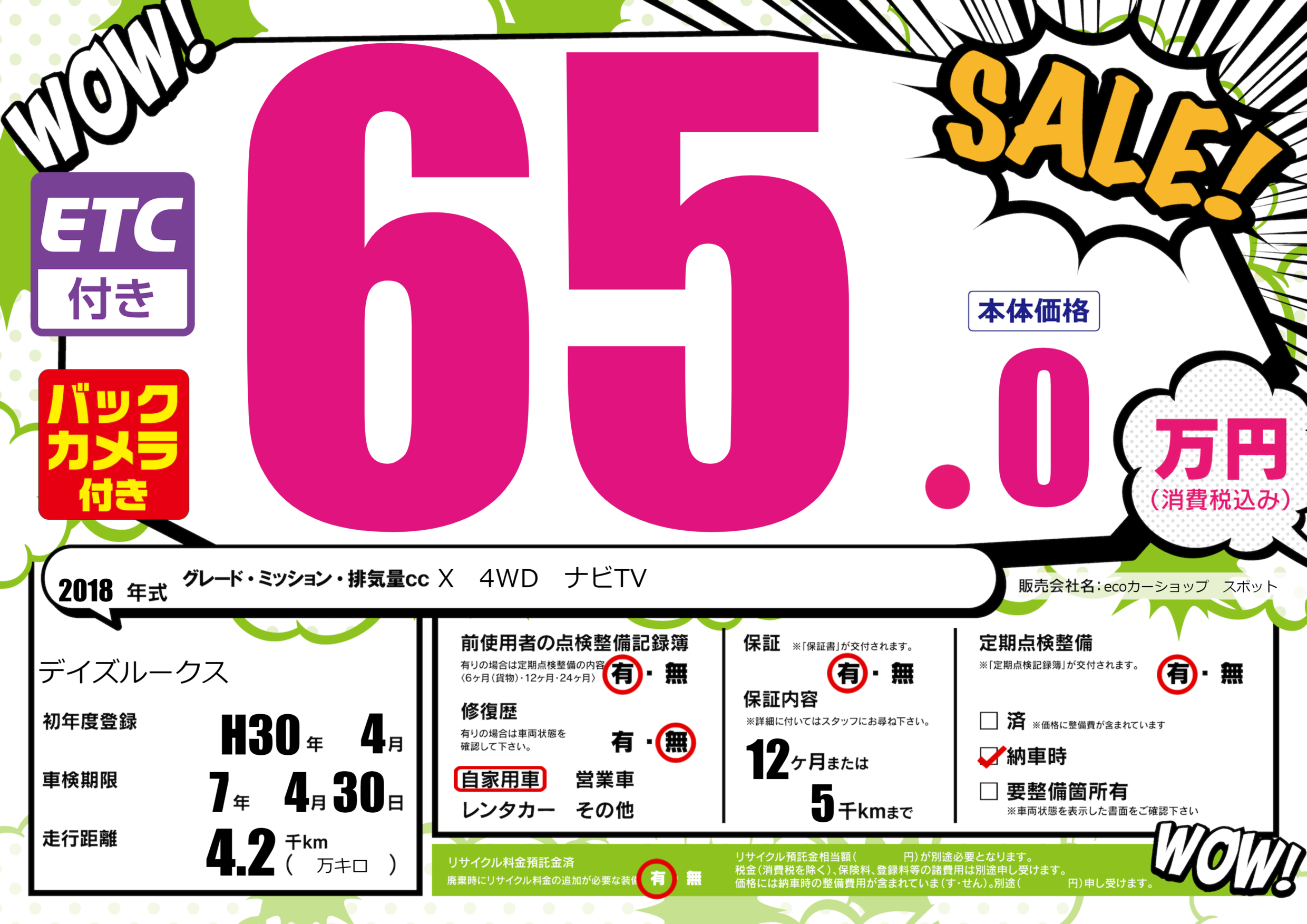 | 走行キロ | 0.4万km | 初年度登録 | H30年4月 |