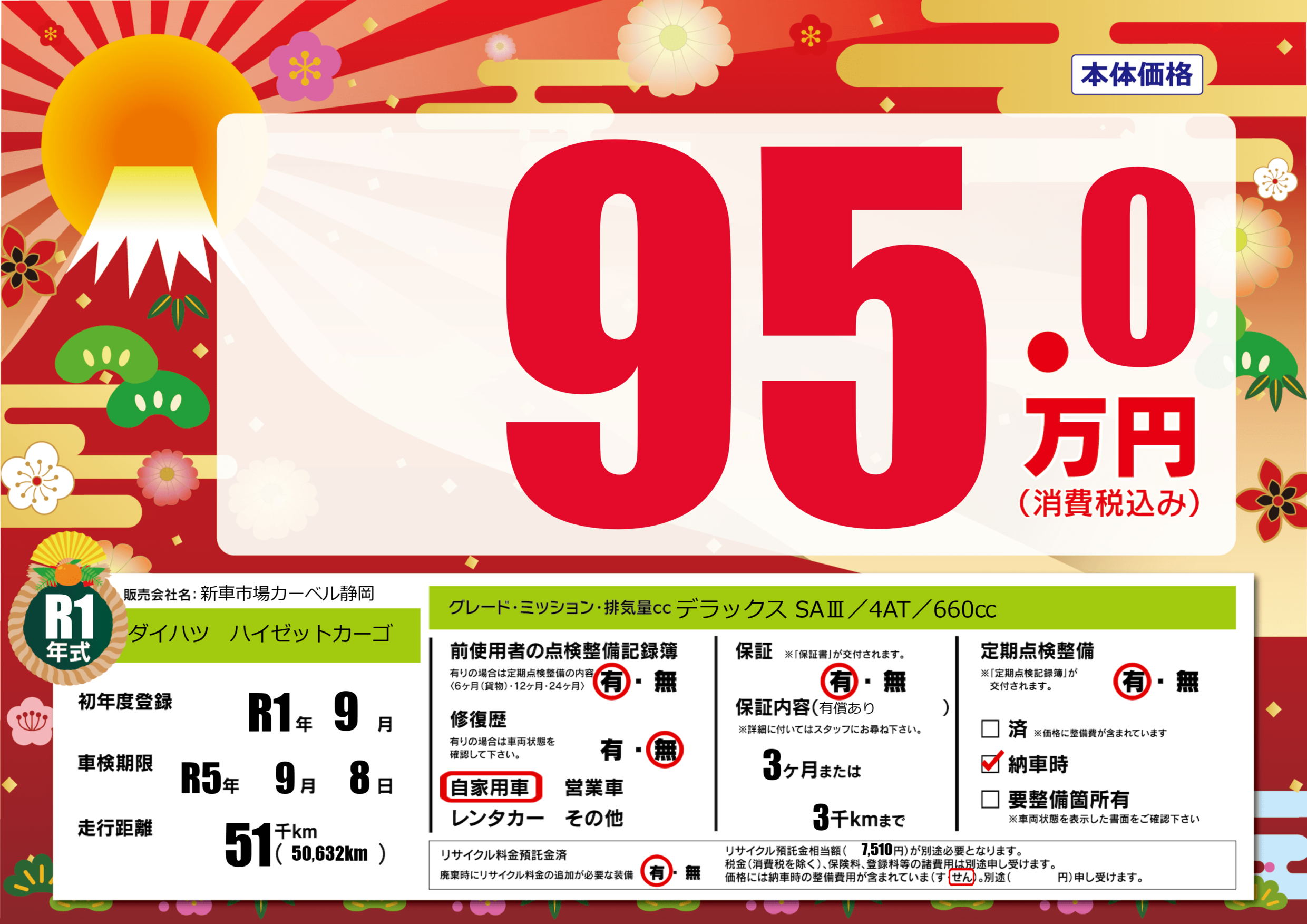 | 車名 | ダイハツ ハイゼットカーゴ | グレード ミッション 排気量 |