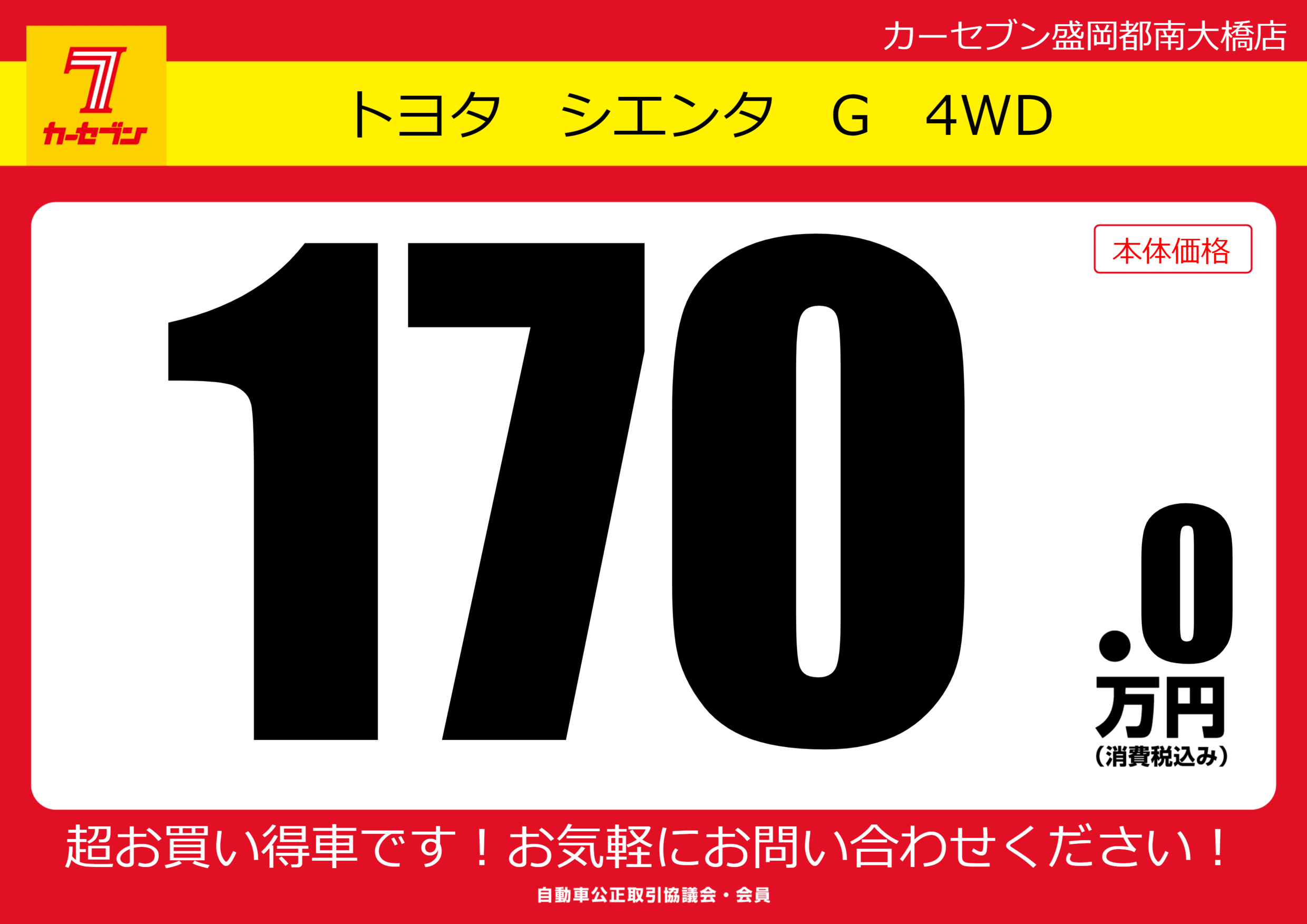 | 車名 | トヨタ シエンタ G 4WD | グレード ミッション 排気量 |