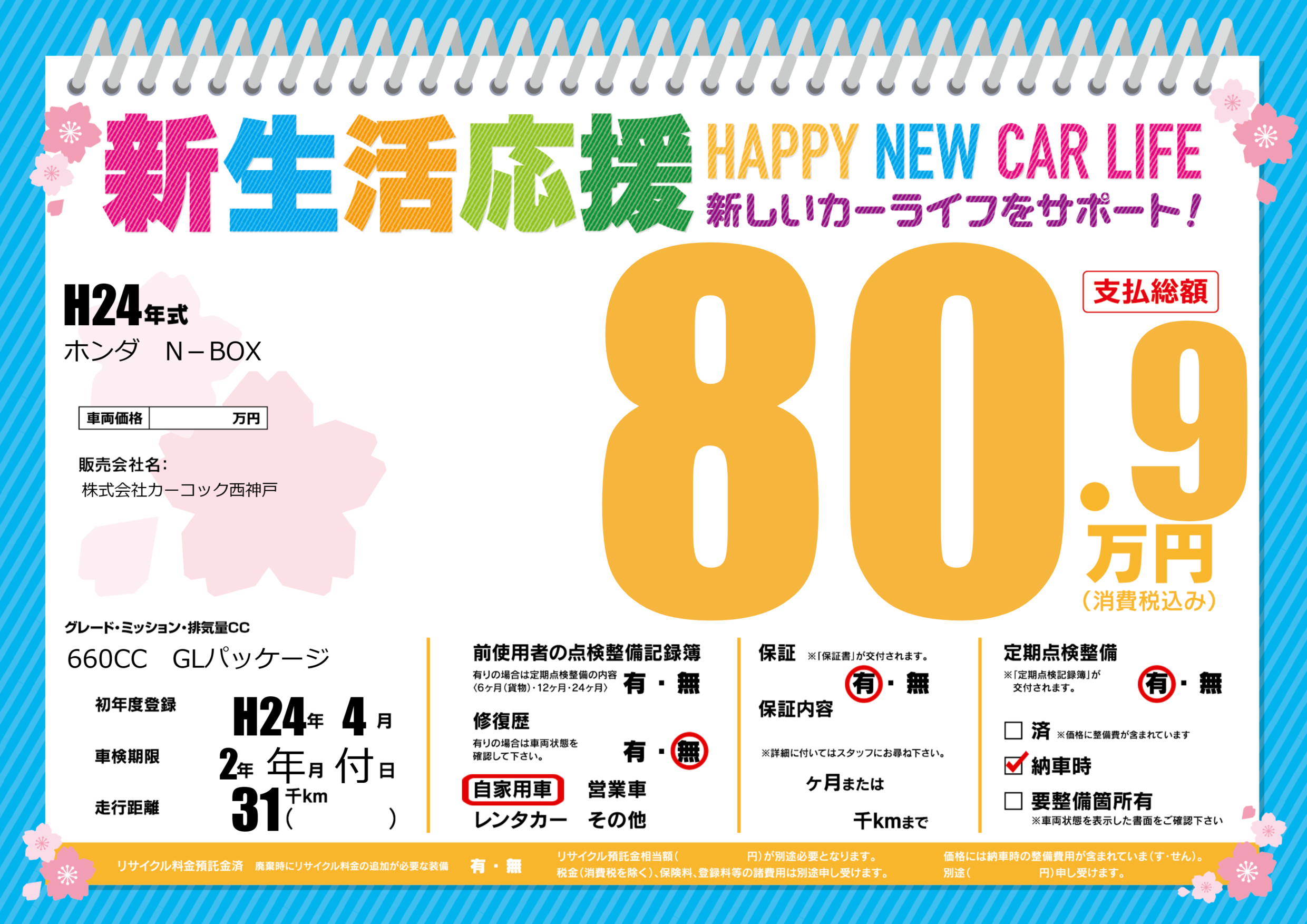 | 定期点検整備 | 定期点検整備あり 納車時あり | ||