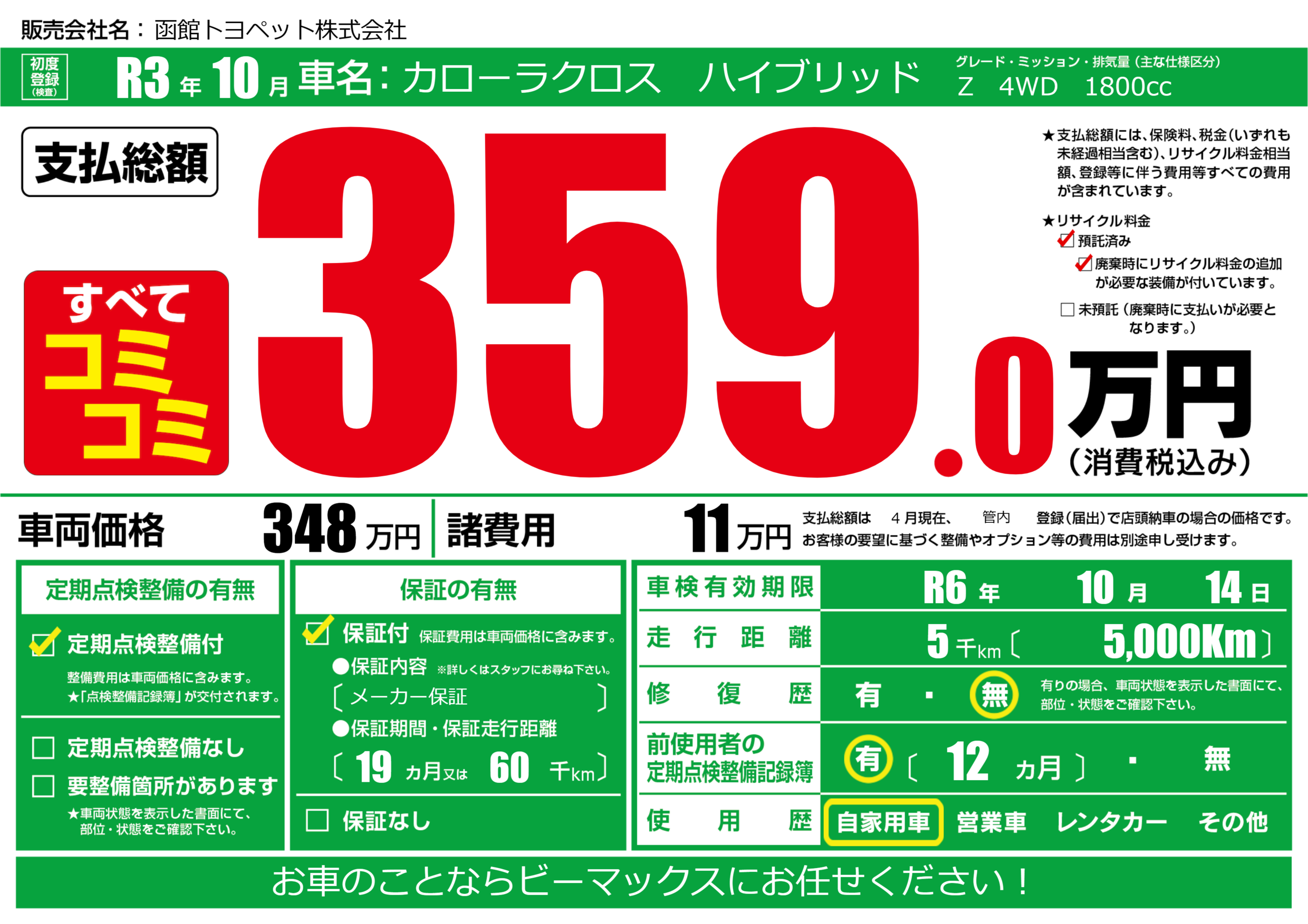 | 走行キロ | 0.5万km | 初年度登録 | R3年10月 |