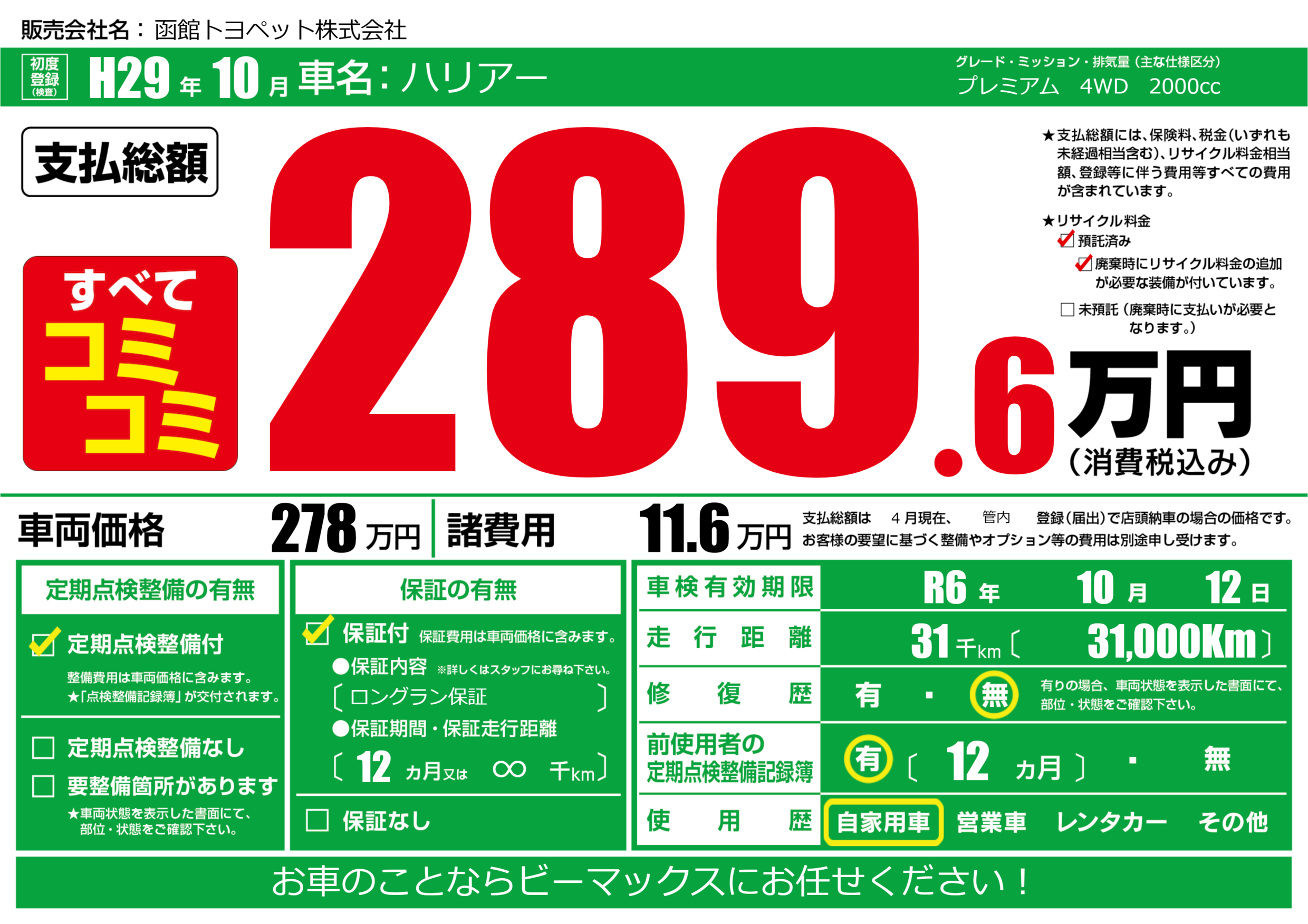 | 走行キロ | 3.1万km | 初年度登録 | H29年10月 |