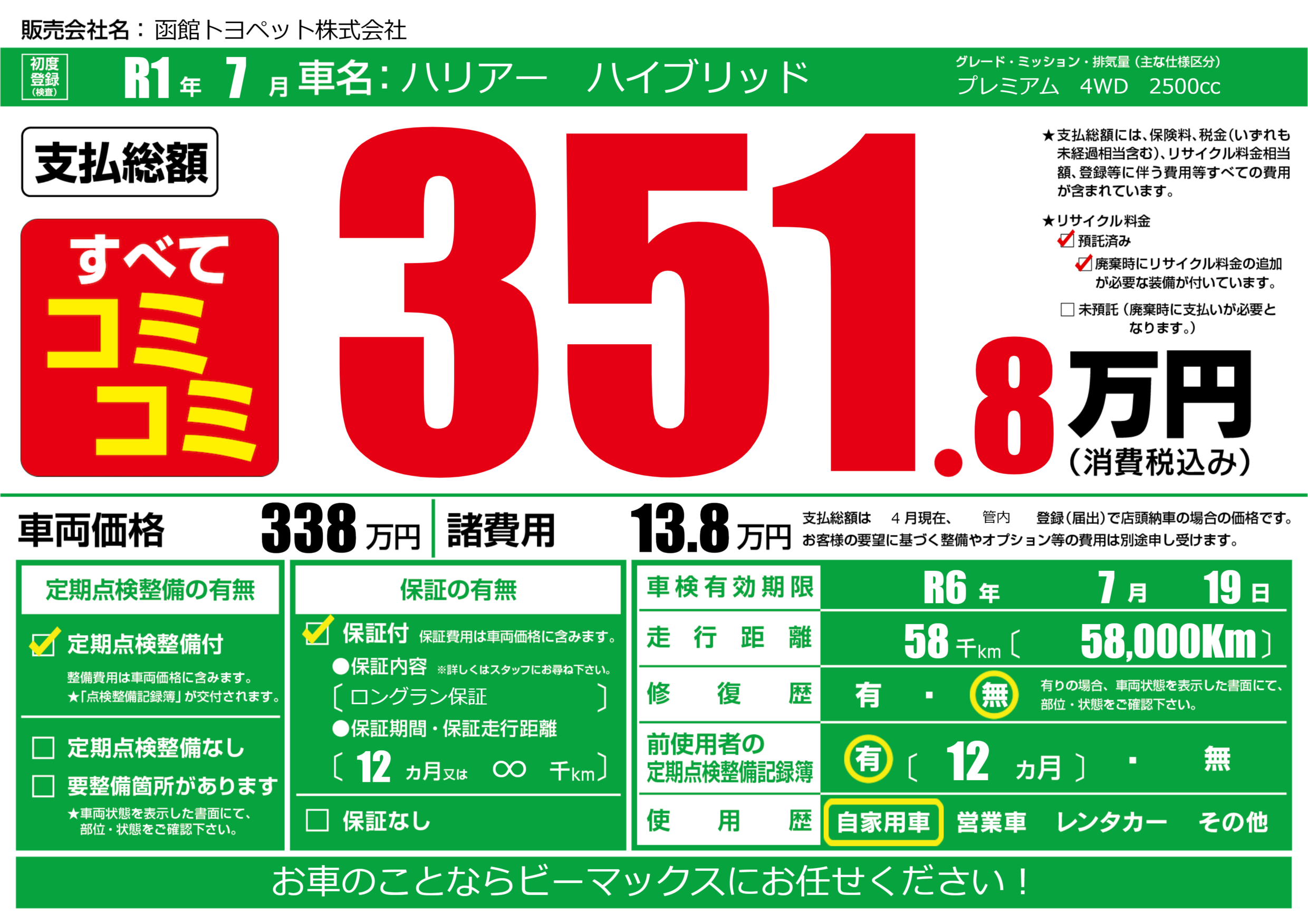 | 車名 | ハリアー ハイブリッド | グレード ミッション 排気量 |