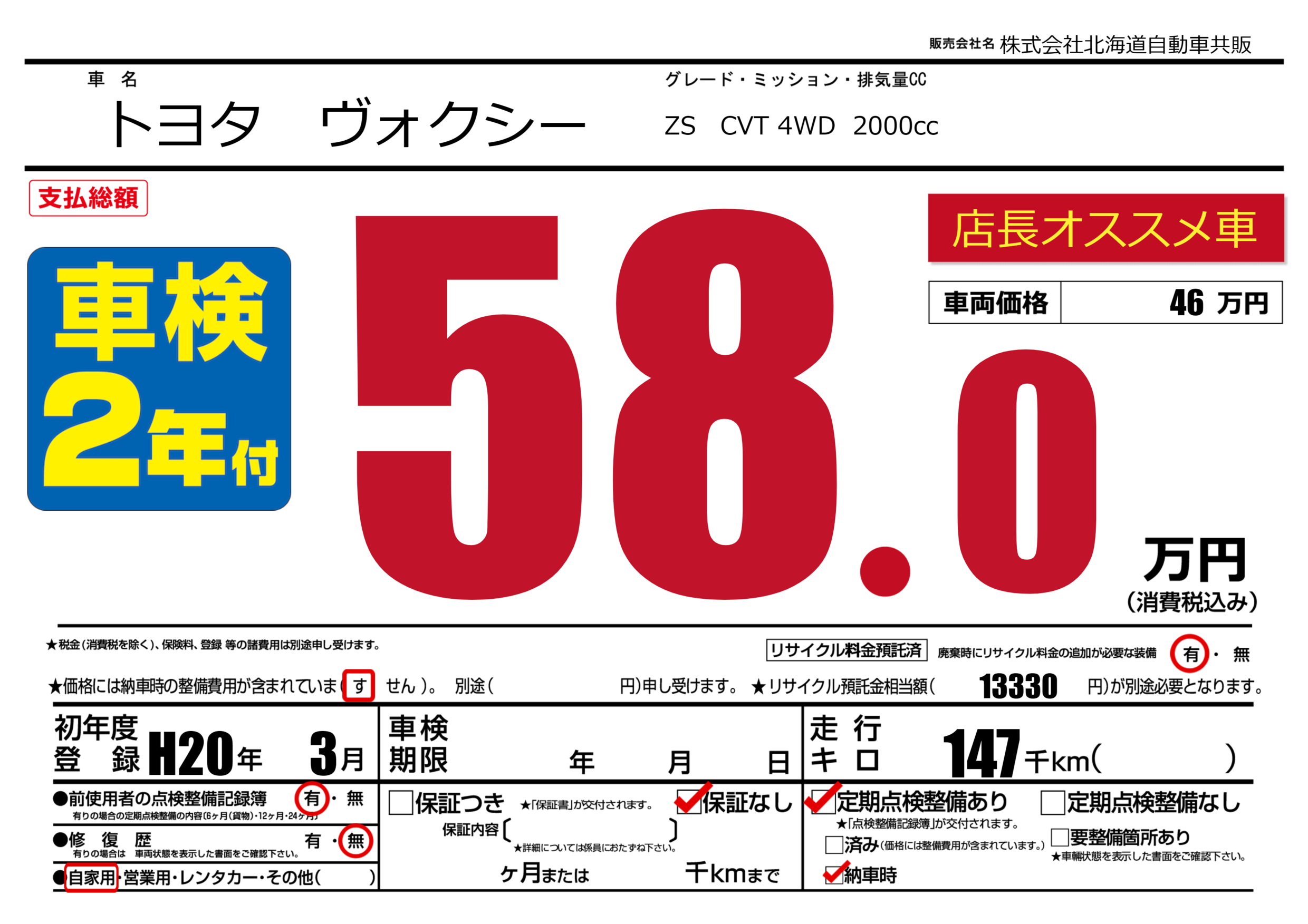 | 走行キロ | 14.7万km | 初年度登録 | H20年3月 |