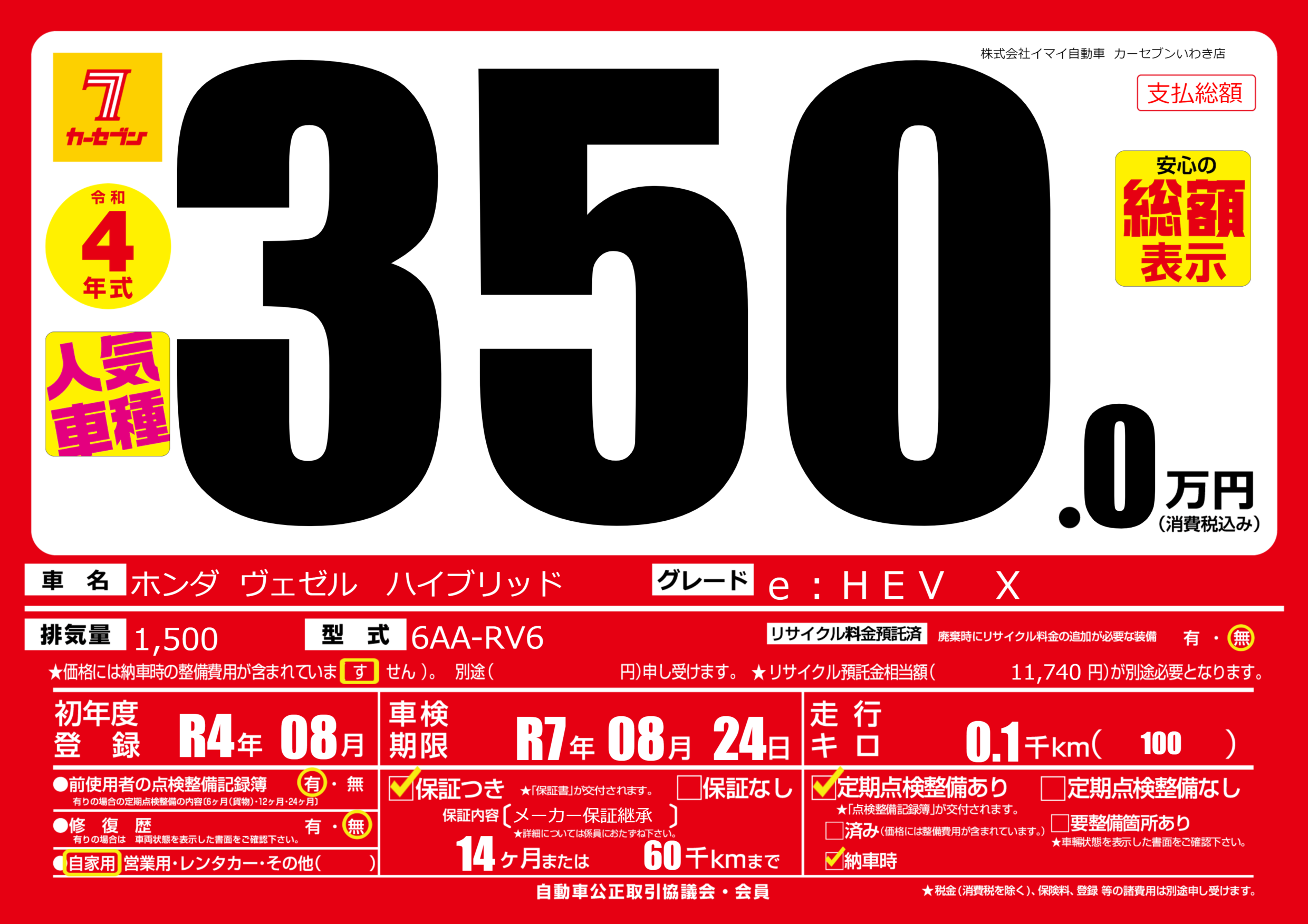 | 走行キロ | - | 初年度登録 | R4年08月 |