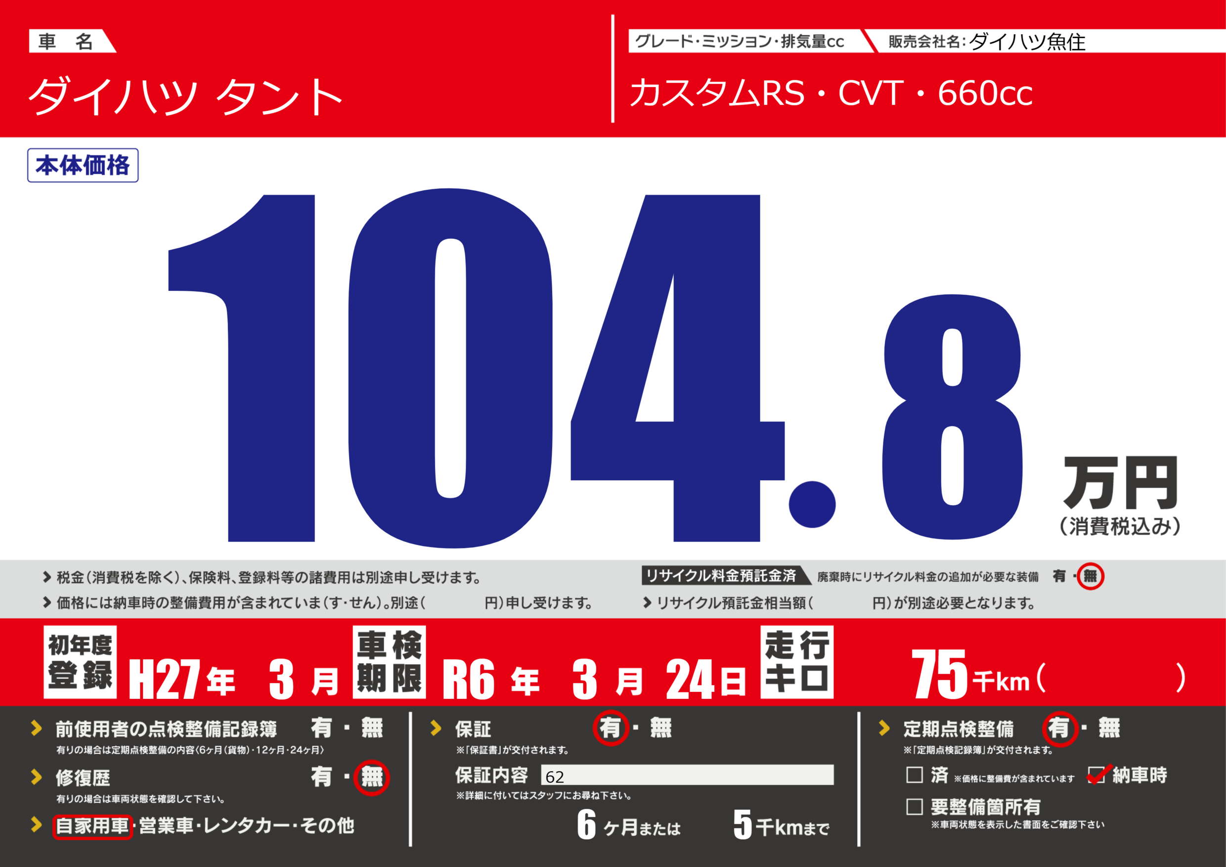 | 車名 | ダイハツ タント | グレード ミッション 排気量 |