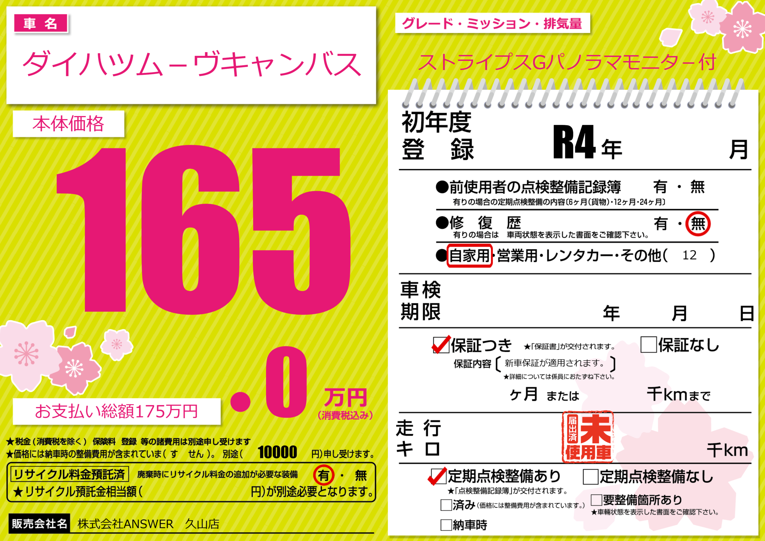 保証付き 保証内容(新車保証が適用されます。) ---ヶ月または()千kmまで |