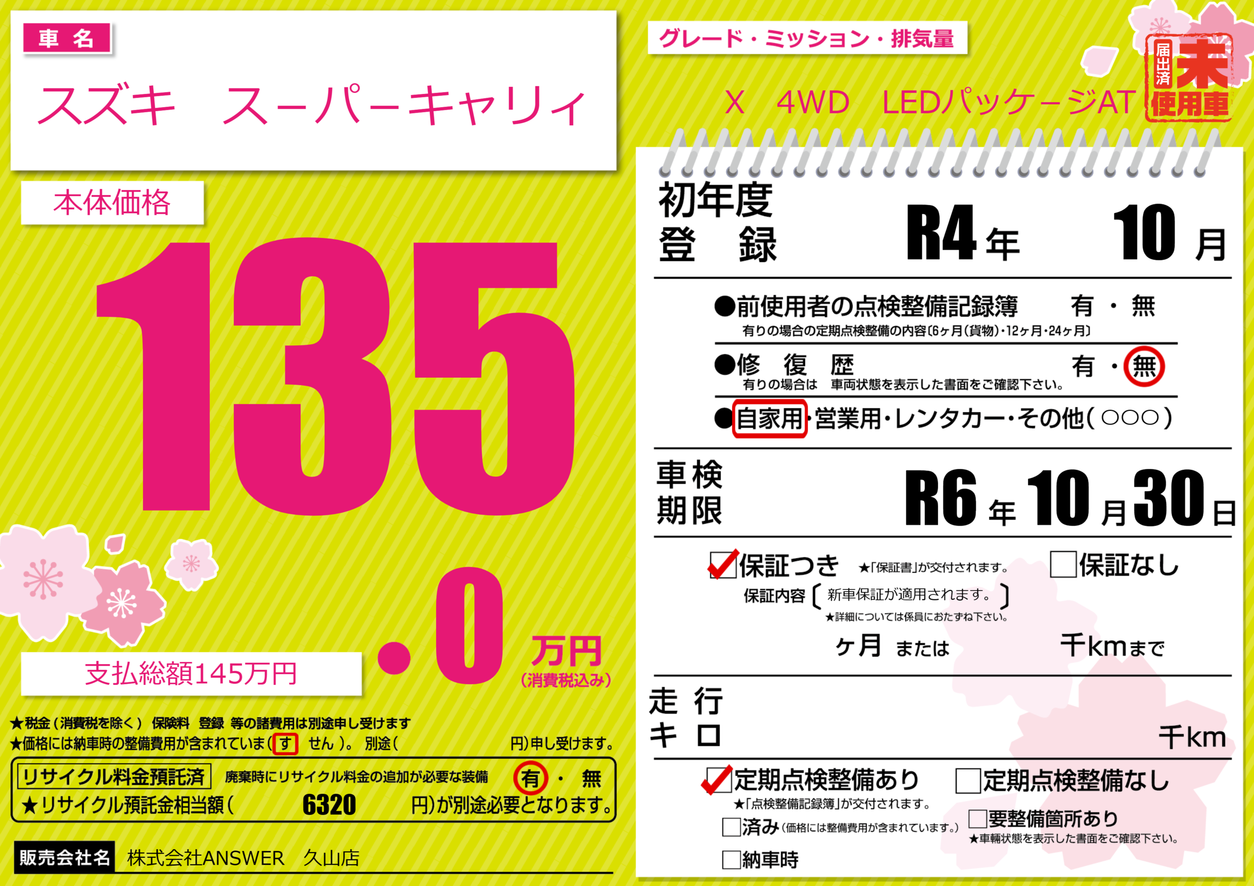 保証内容(新車保証が適用されます。) ヶ月または千km