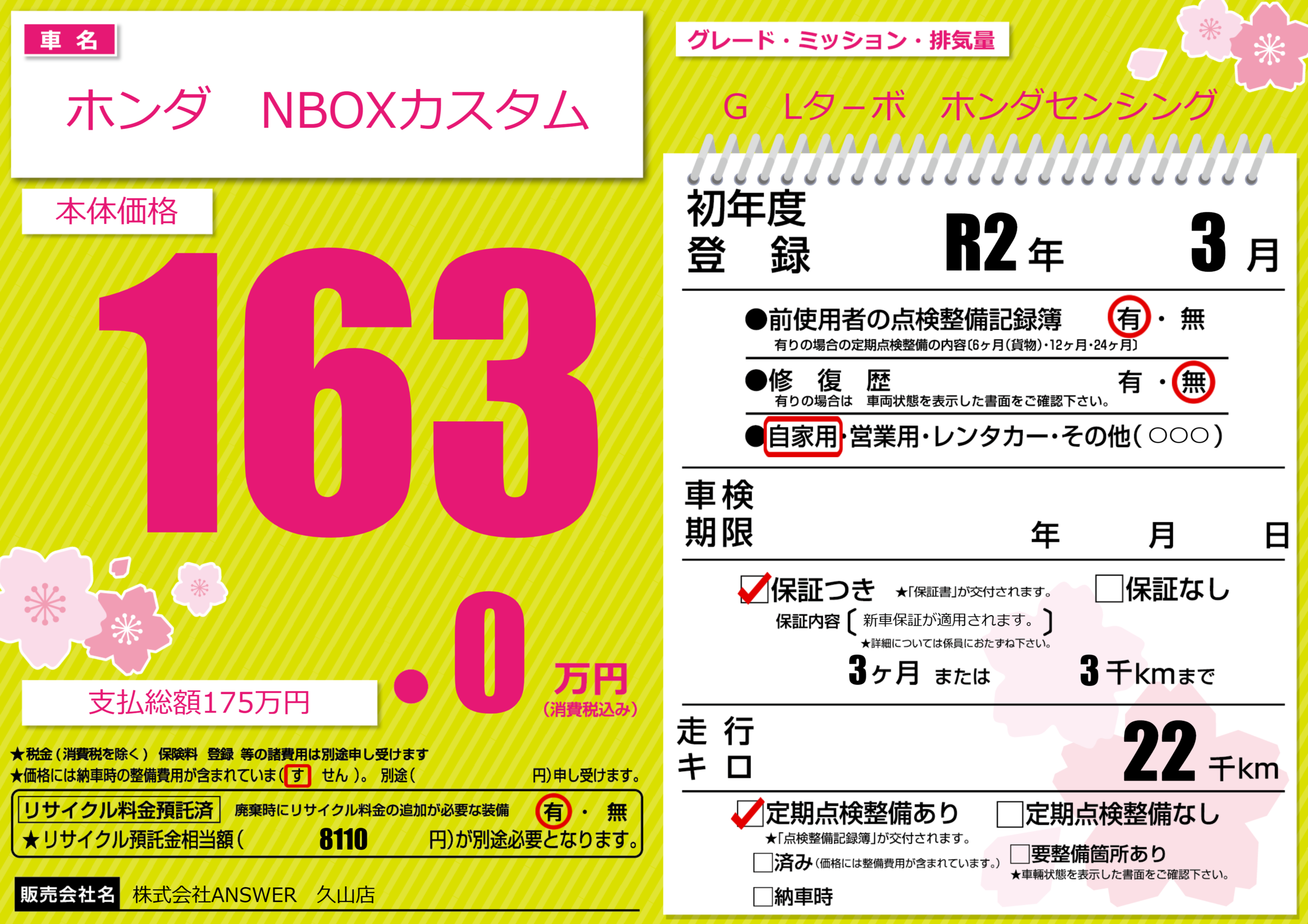 | 車名 | ホンダ NBOXカスタム | グレード ミッション 排気量 |