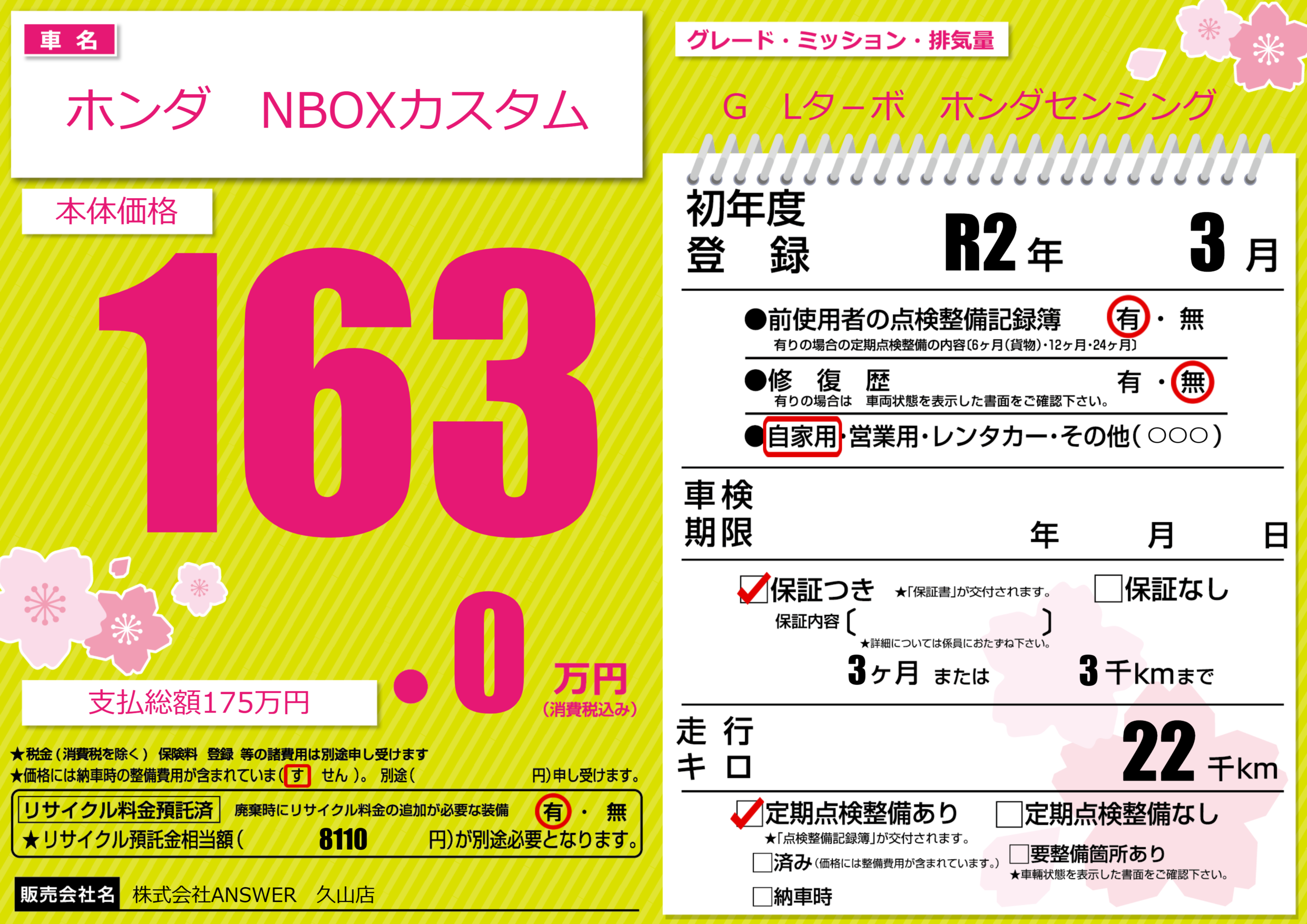 保証付き 保証内容(---) 3ヶ月または(3)千kmまで |