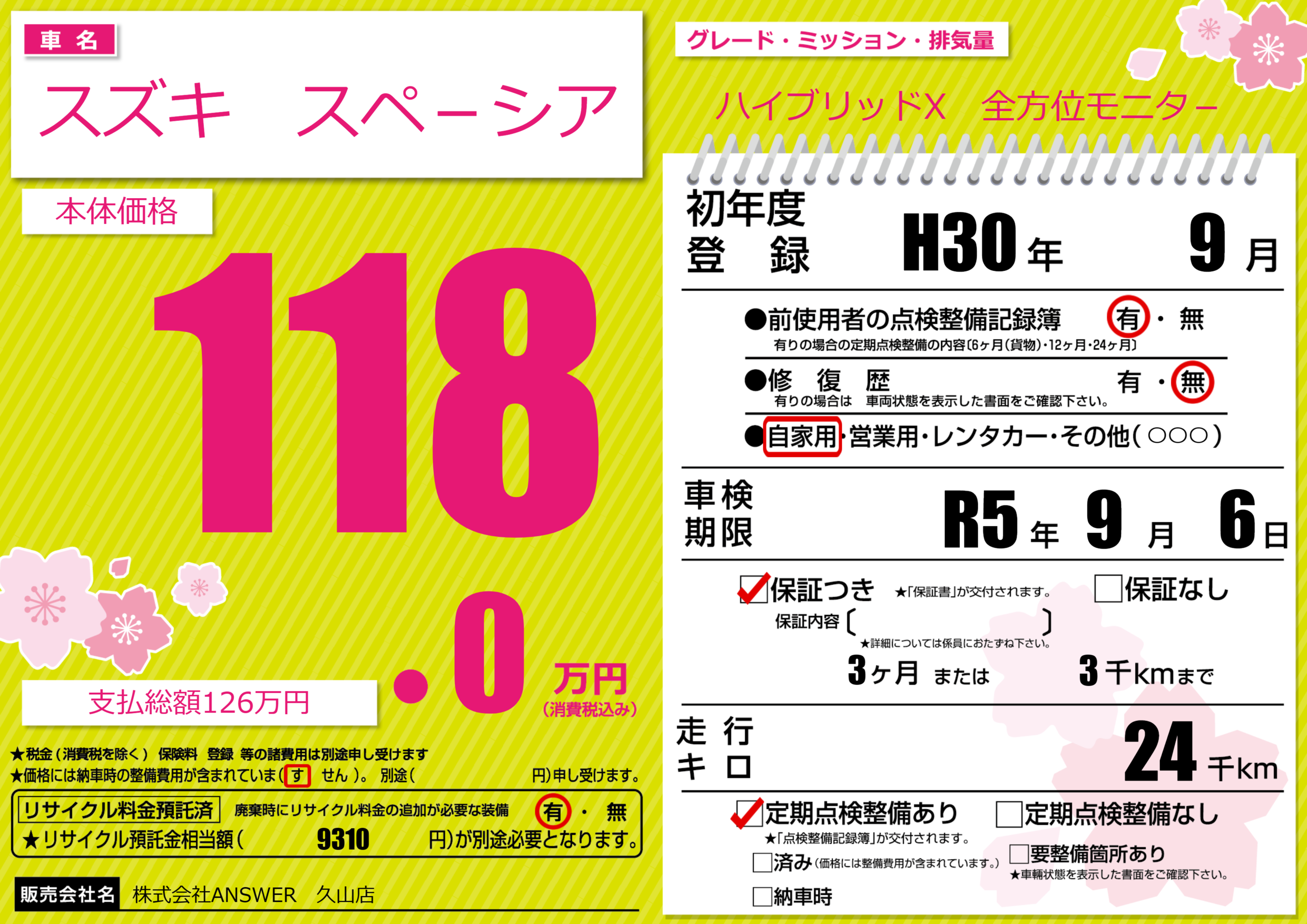 | 車検制限 | R5年 9月 6日 | ||