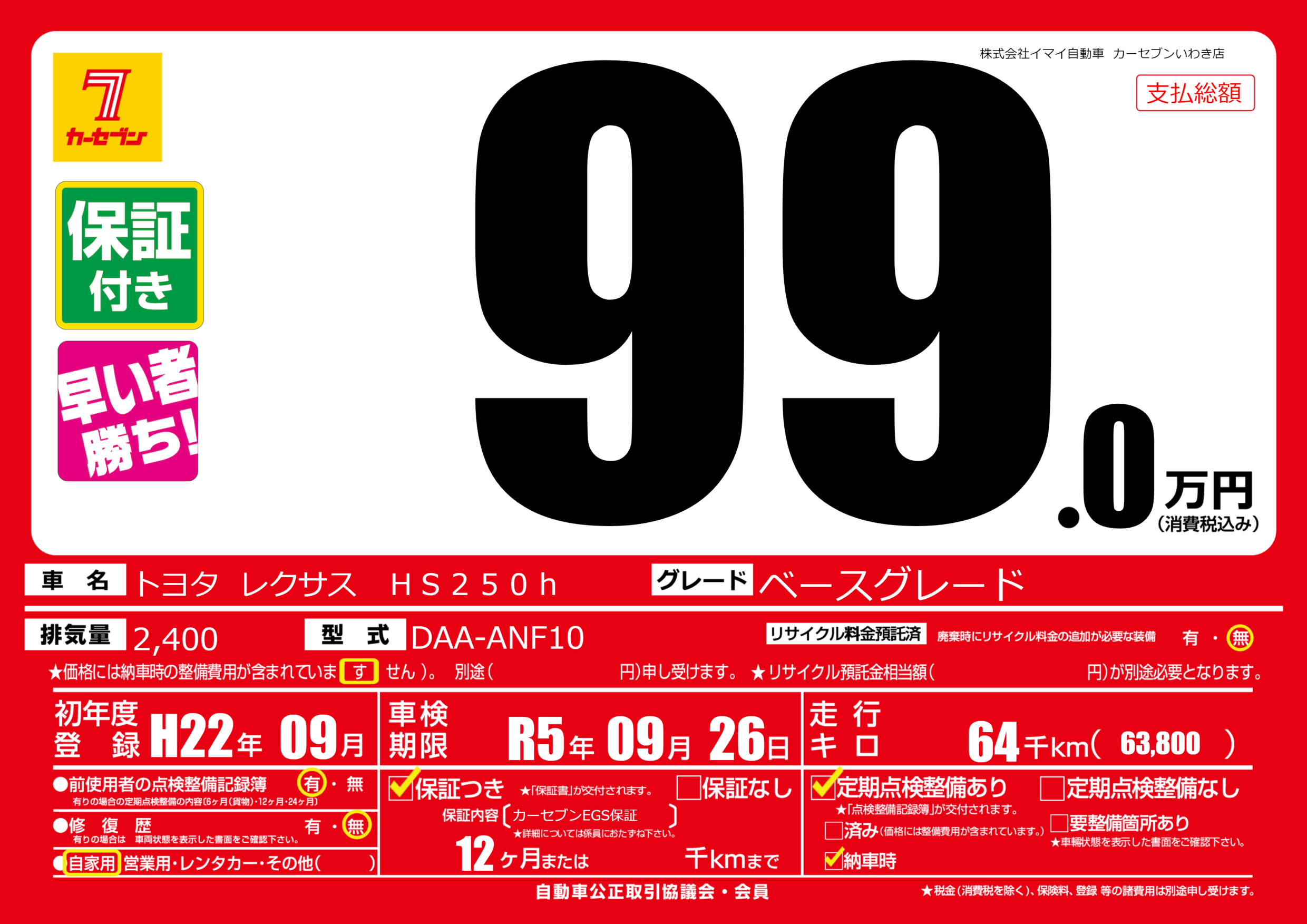 | 初年度登録 | H22年09月 | ||