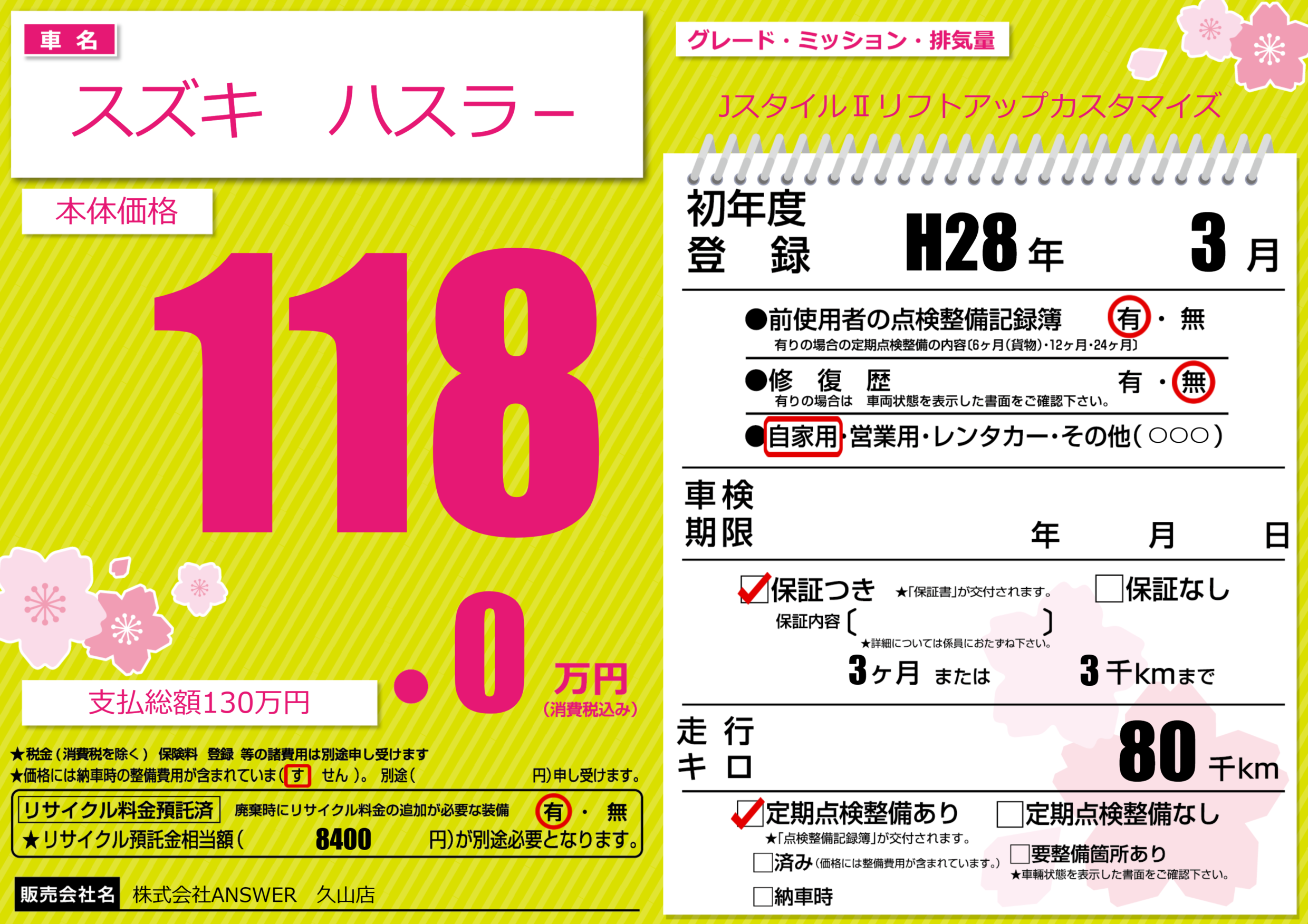 | 走行キロ | 8万km | 初年度登録 | H28年3月 |