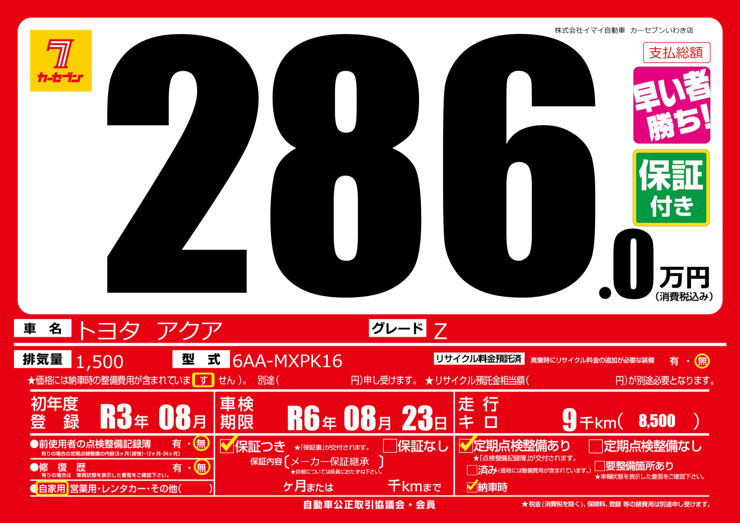 | 車名 | トヨタ アクア | グレード ミッション 排気量 |