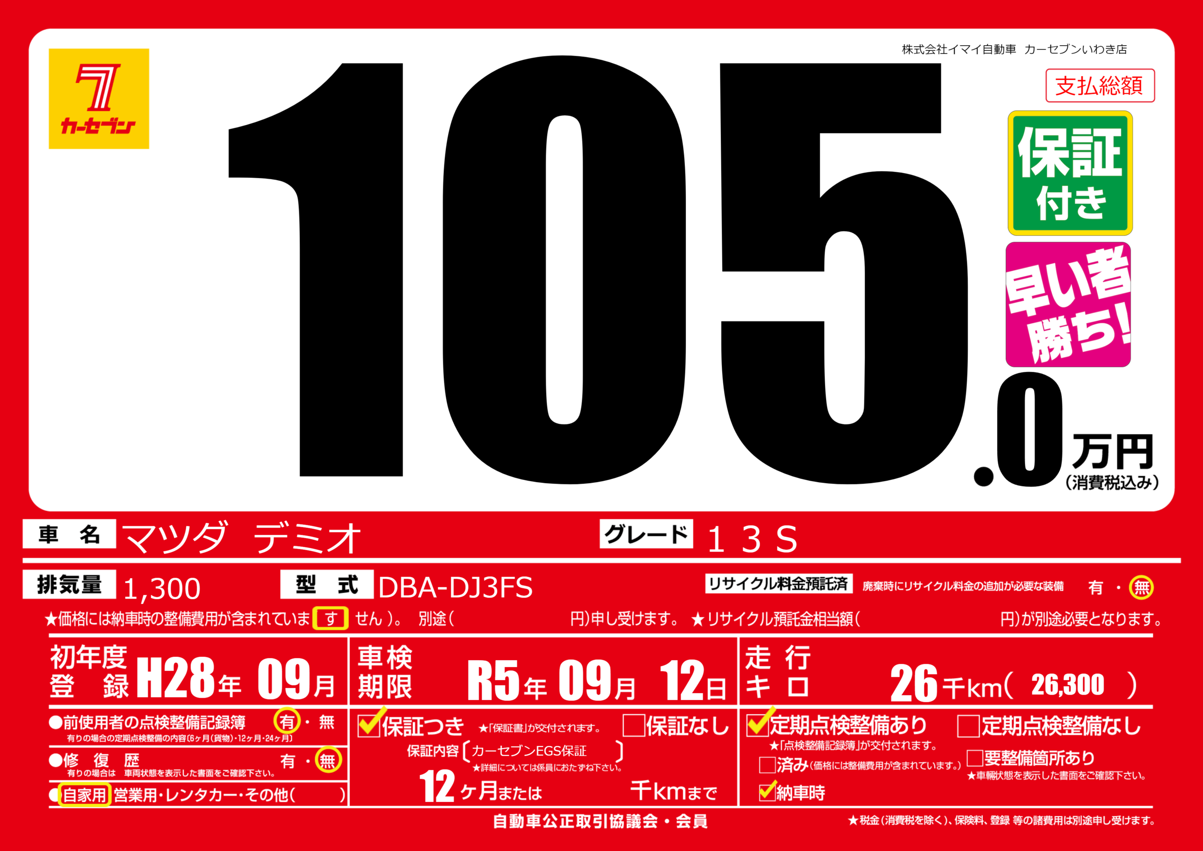 | 車名 | マツダ デミオ | グレード ミッション 排気量 |