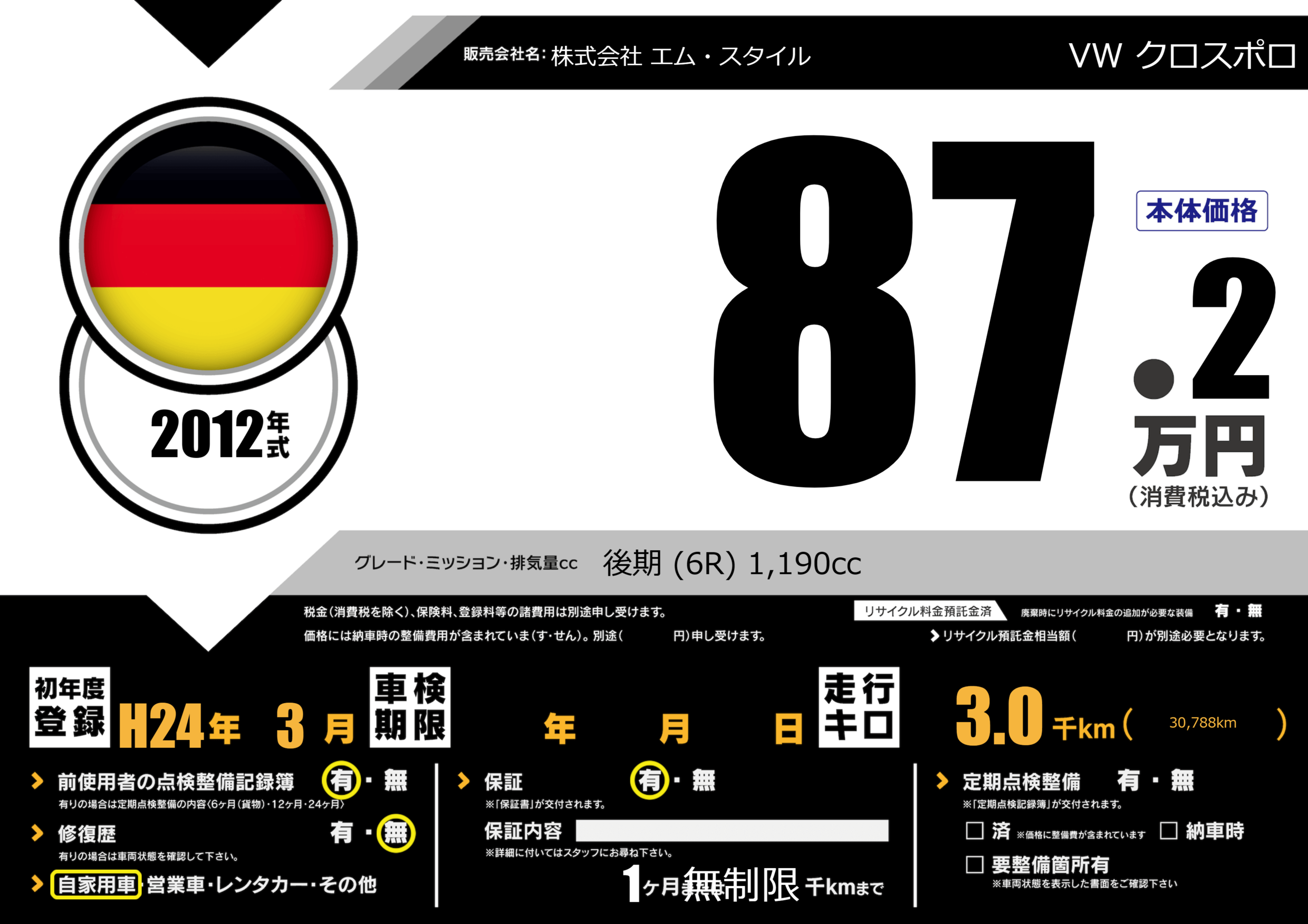 | 車名 | VW クロスポロ | グレード ミッション 排気量 |