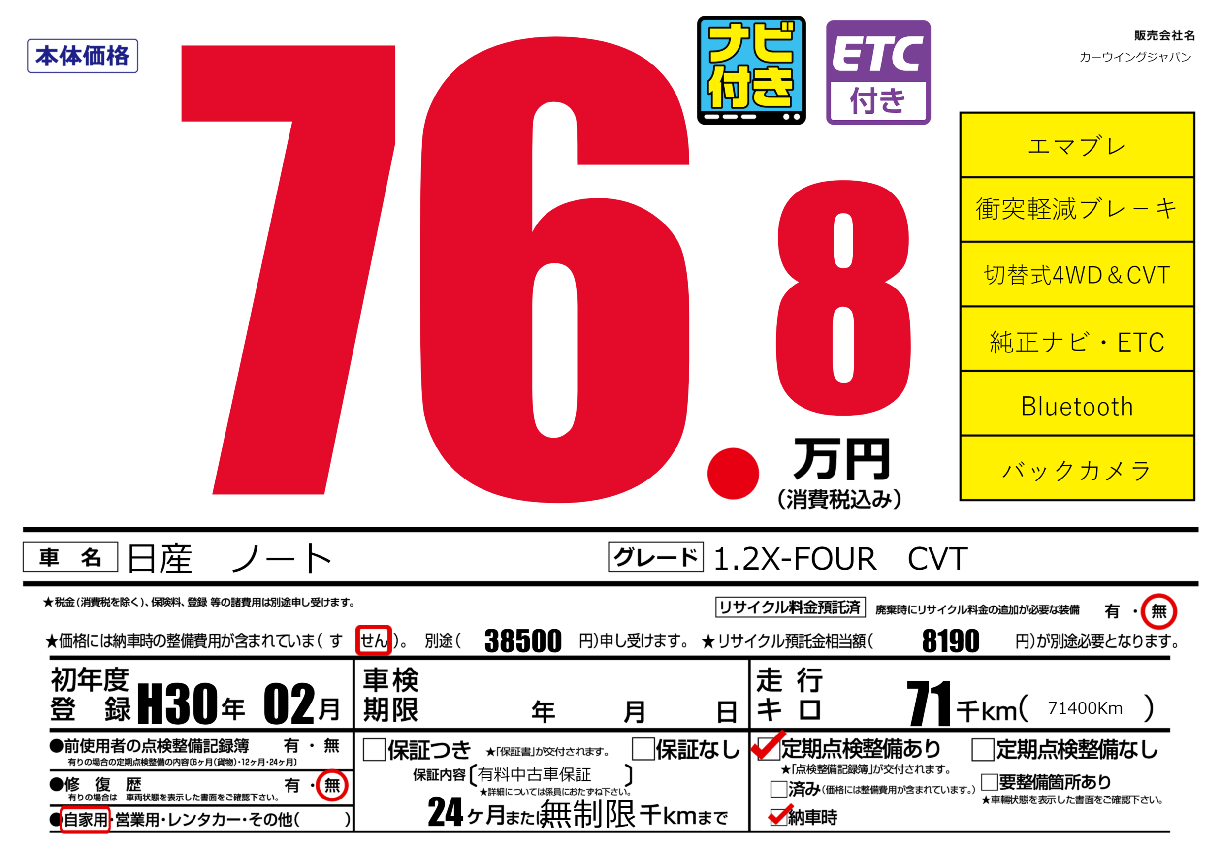 | 車名 | 日産 ノート | グレード ミッション 排気量 |