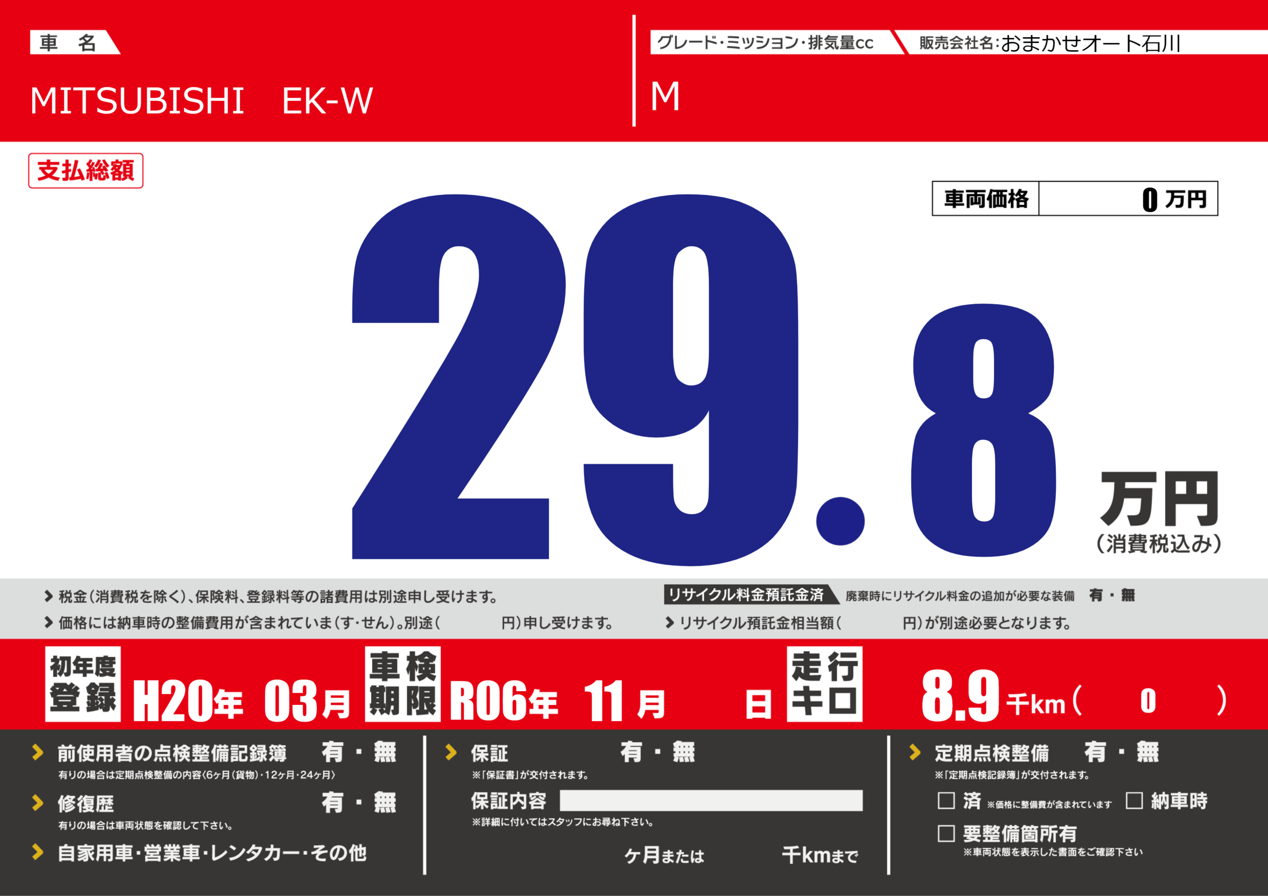 | 車名 | MITSUBISHI EK-W | グレード ミッション 排気量 |