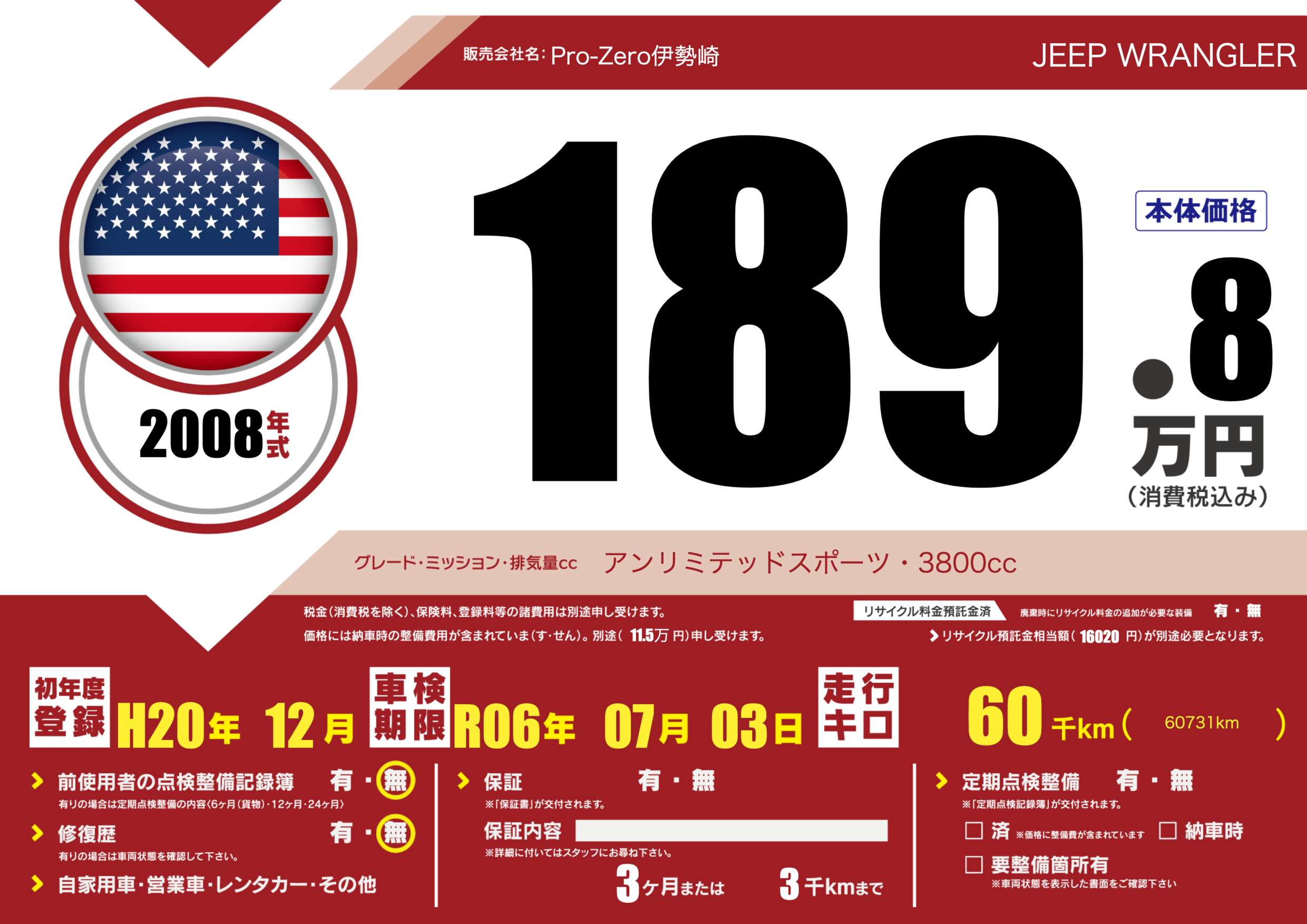 | 車名 | JEEP WRANGLER | グレード ミッション 排気量 |