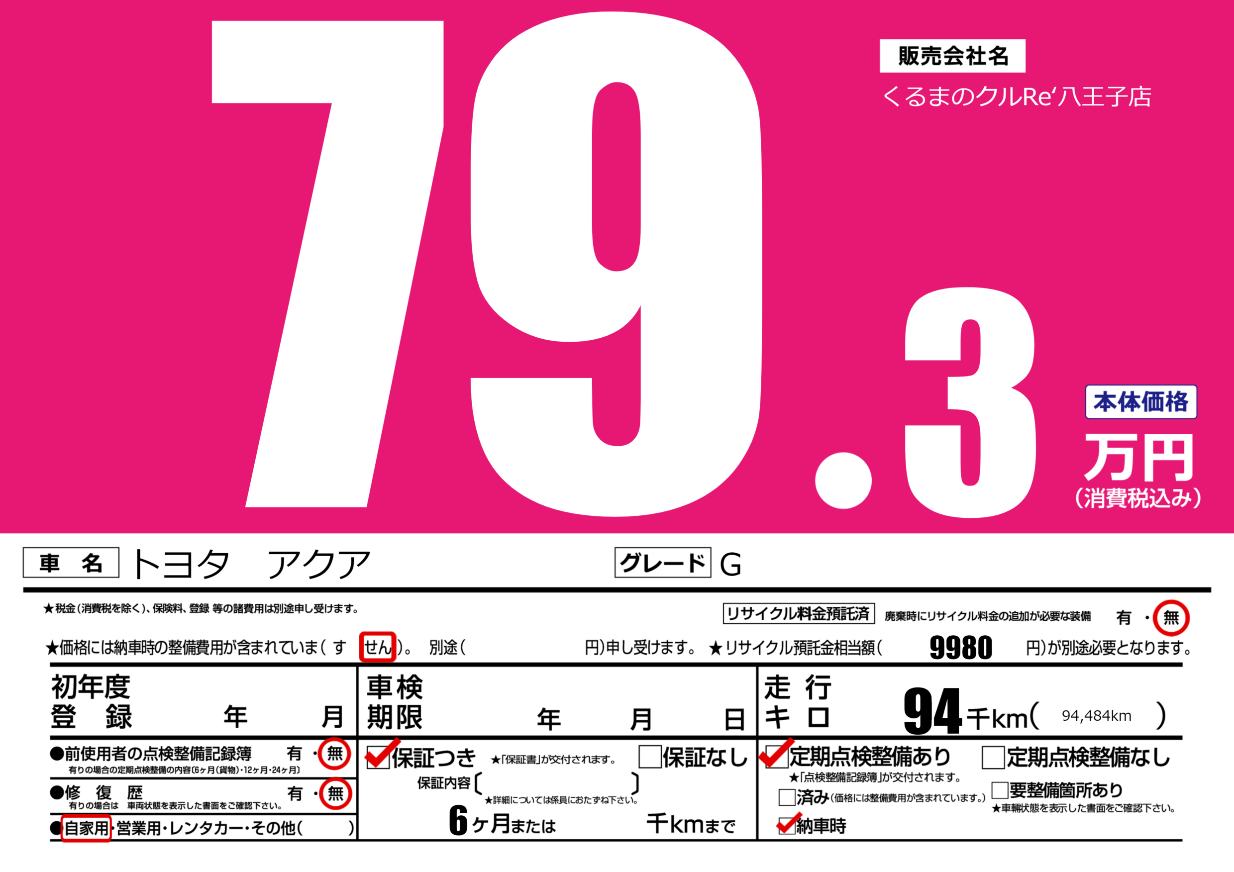 | 車名 | トヨタ アクア | グレード ミッション 排気量 |
