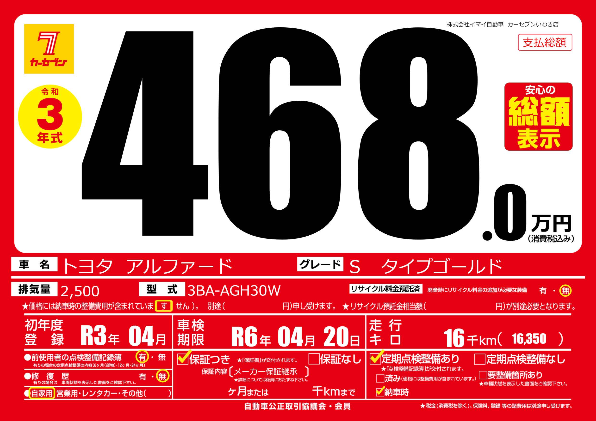 | 車名 | トヨタ アルファード | グレード ミッション 排気量 |