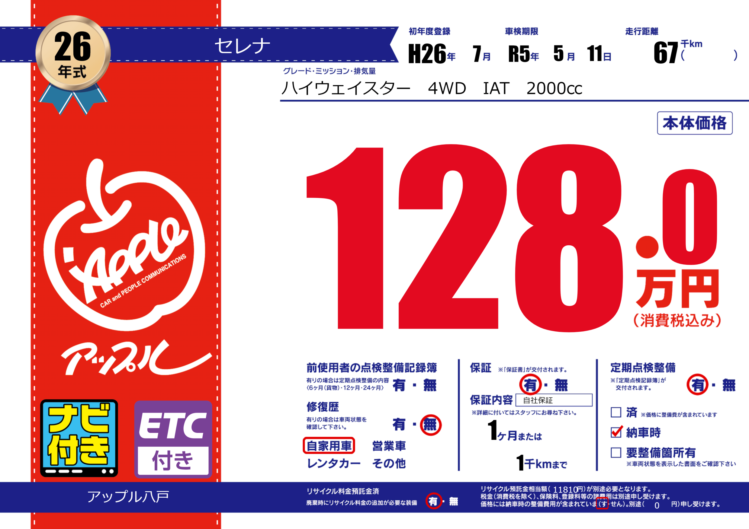 | 走行キロ | 6.7万km | 初年度登録 | H26年7月 |
