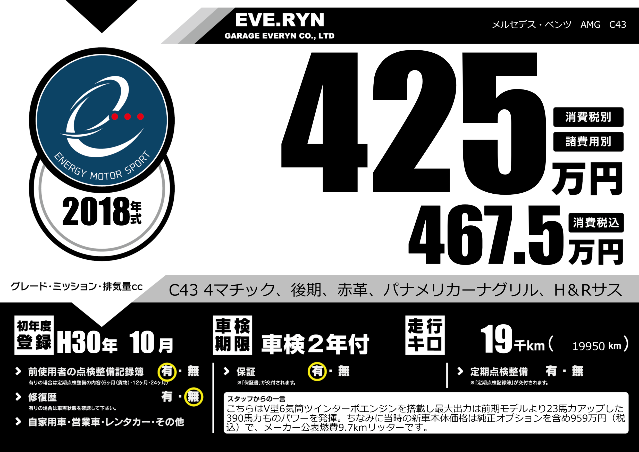 | 車名 | メルセデス・ベンツ AMG C43 | グレード ミッション 排気量 |