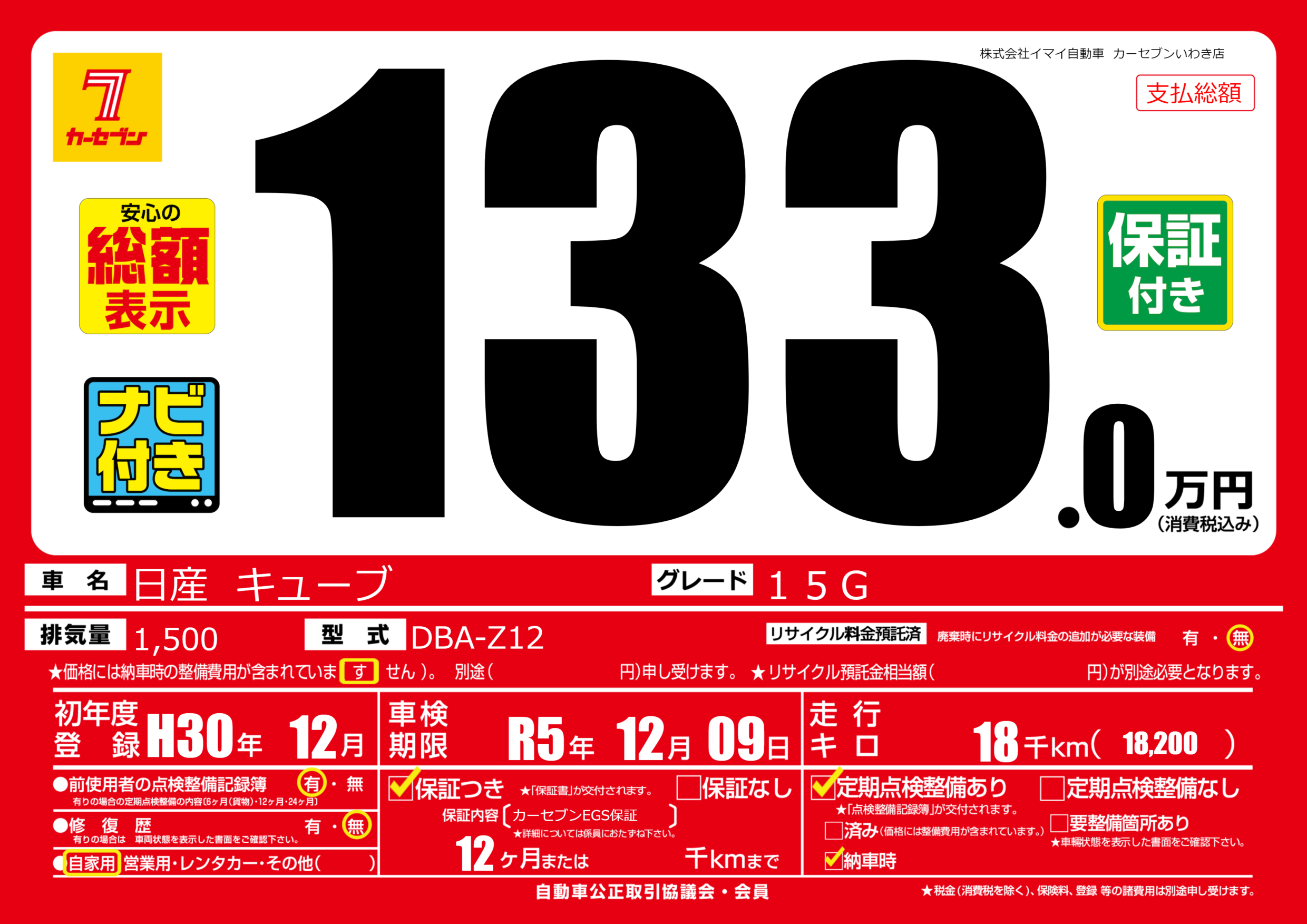 | 車名 | 日産 キューブ | グレード ミッション 排気量 |