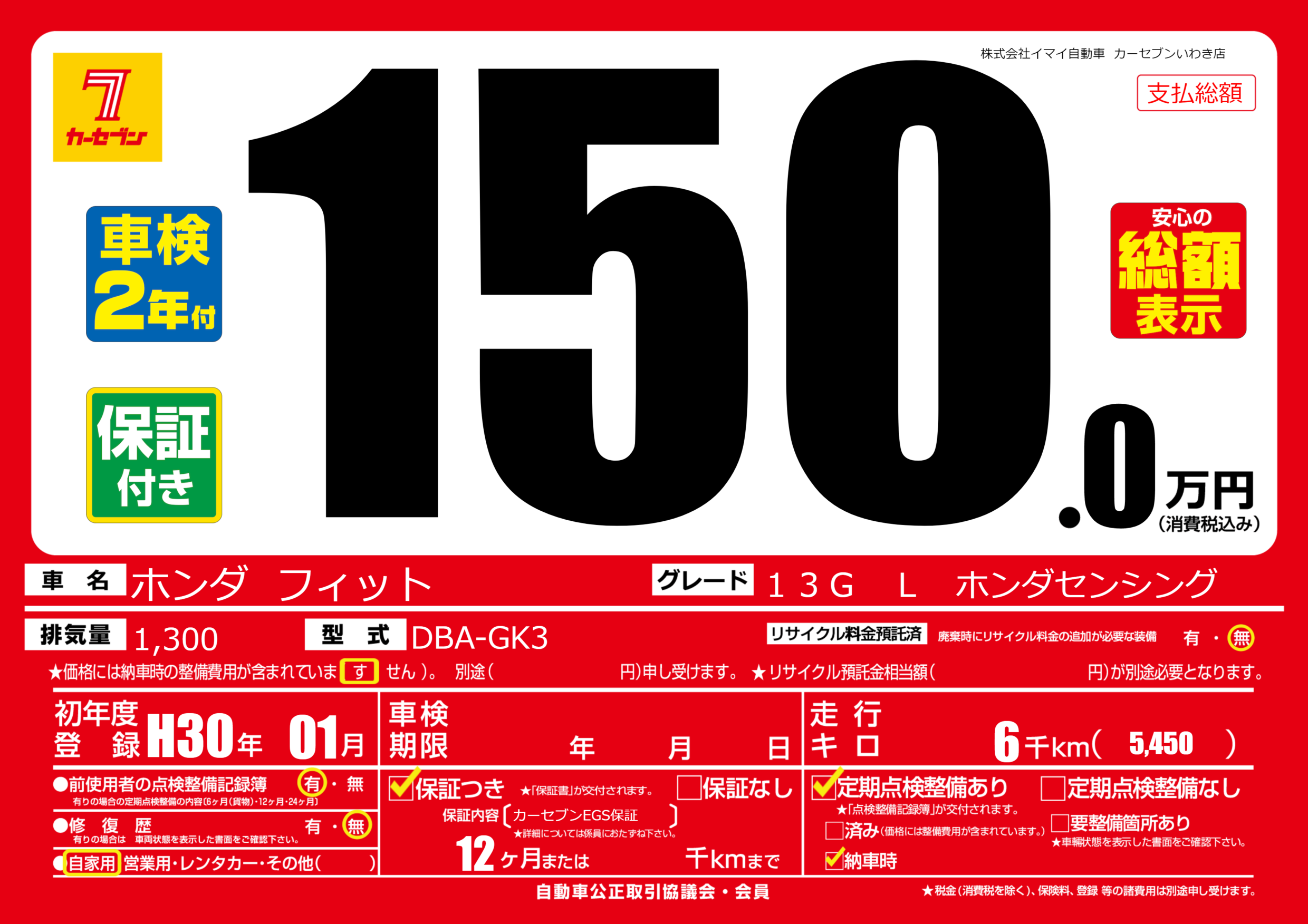 保証付き 保証内容(カーセブンEGS保証) 12ヶ月または千km |