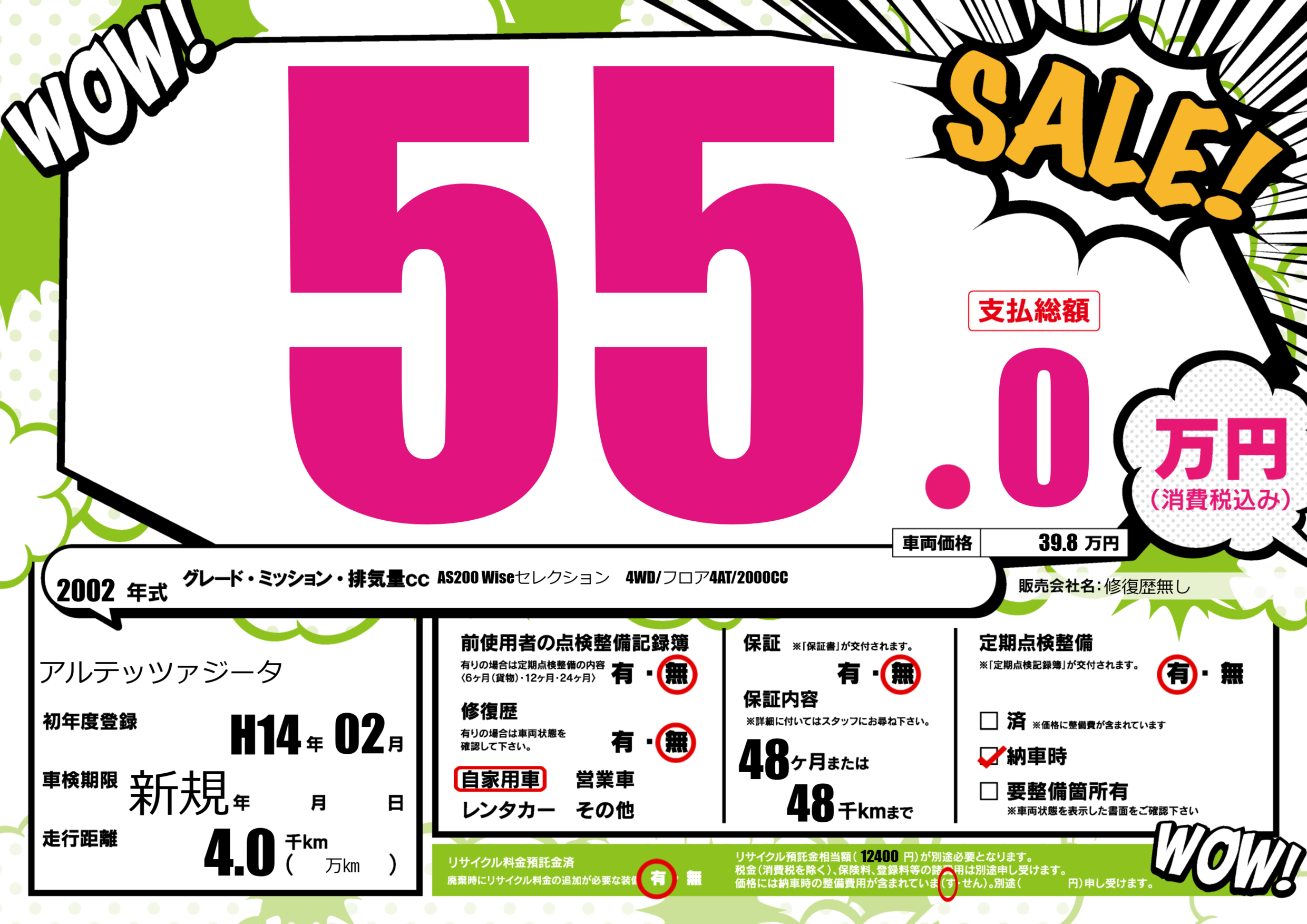 保証なし 保証内容(---) 48ヶ月または(48)千kmまで |