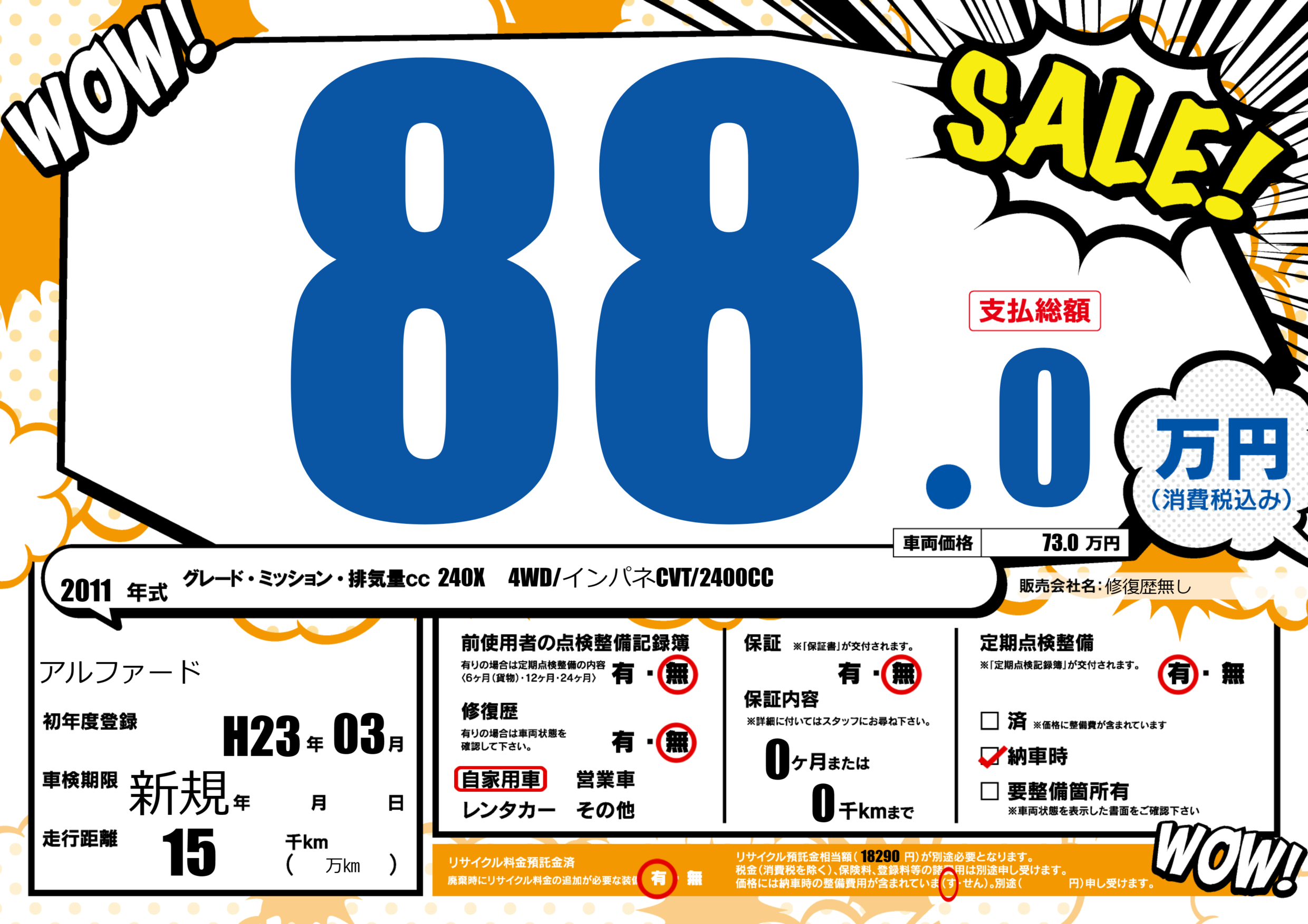 | 走行キロ | 1.5万km | 初年度登録 | H23年03月 |