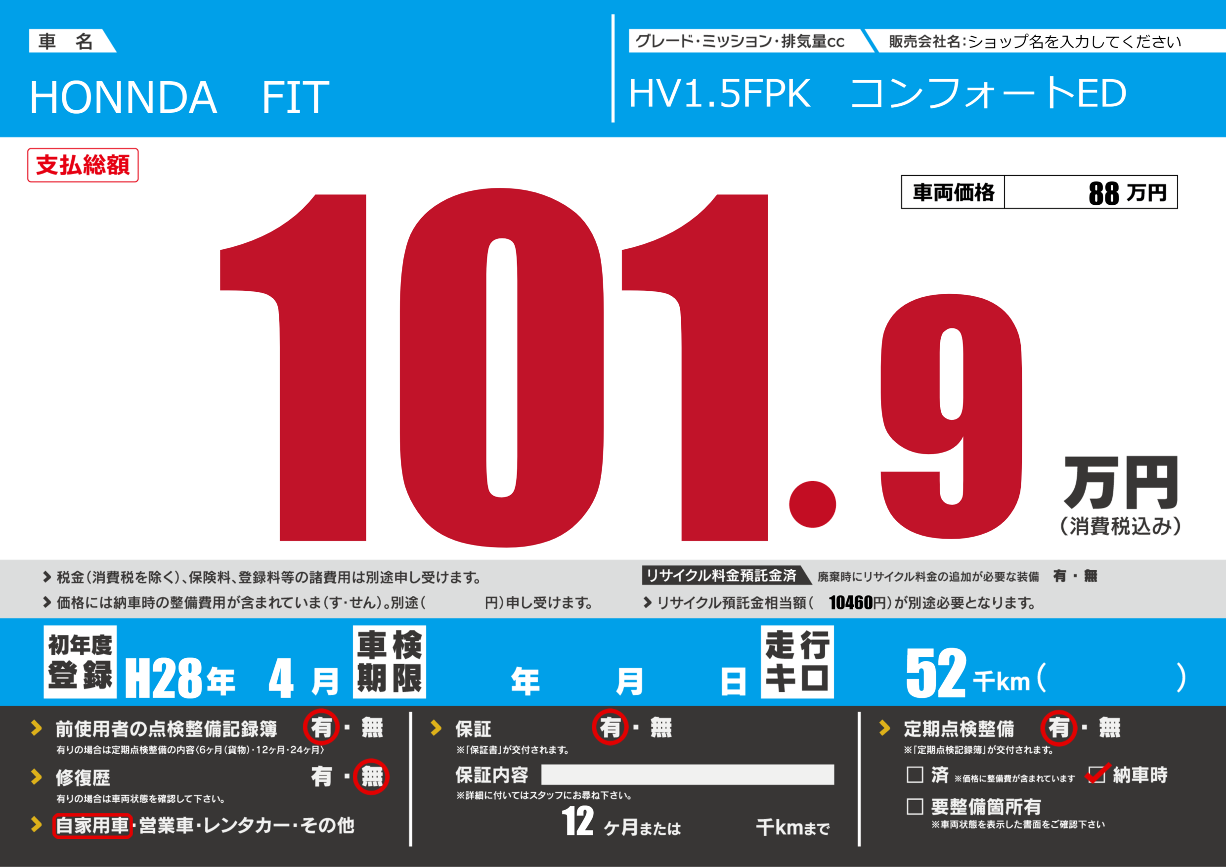 | 定期点検整備 | 定期点検整備あり 納車時あり | ||
