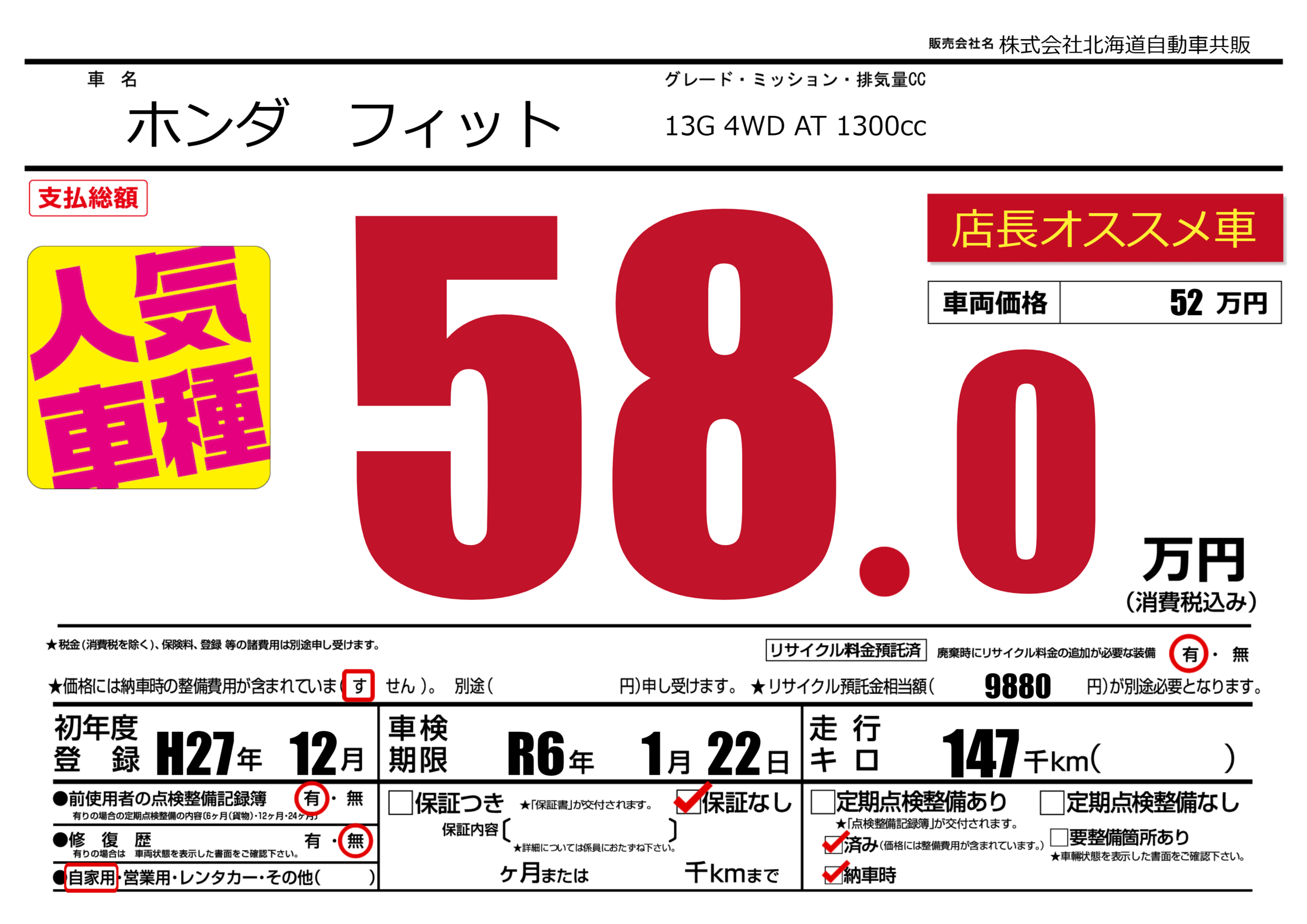 あり | 車検制限 | R6年1月22月 |