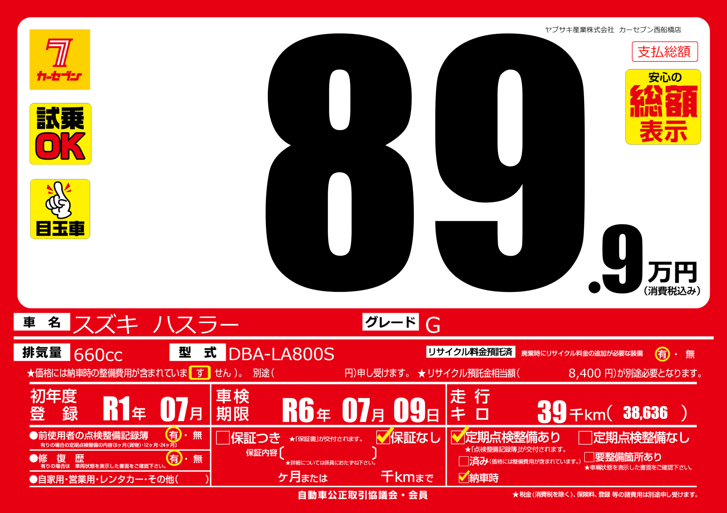 | 定期点検整備 | 定期点検整備あり 納車時あり | ||