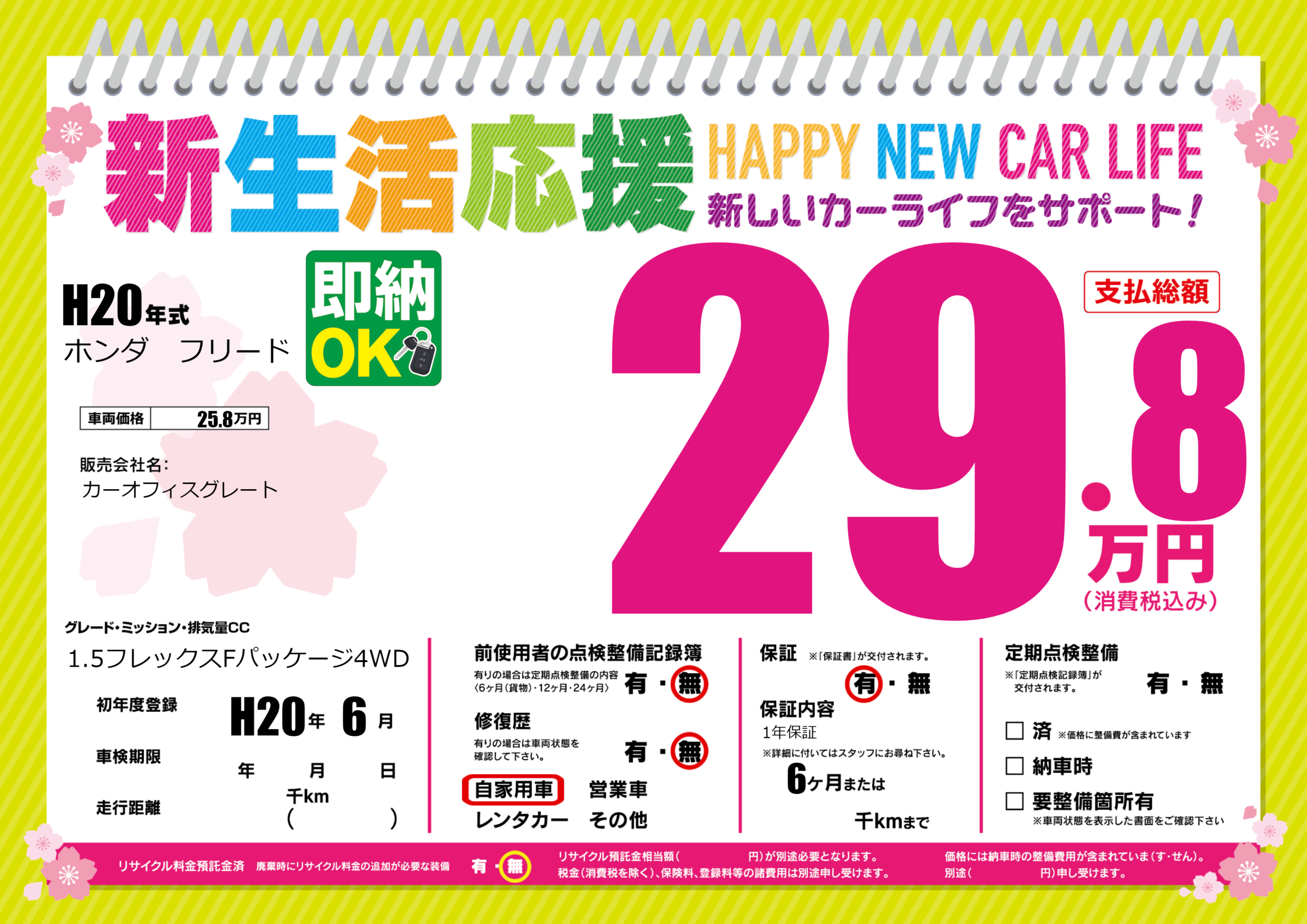 | 車名 | ホンダ フリード | グレード ミッション 排気量 |