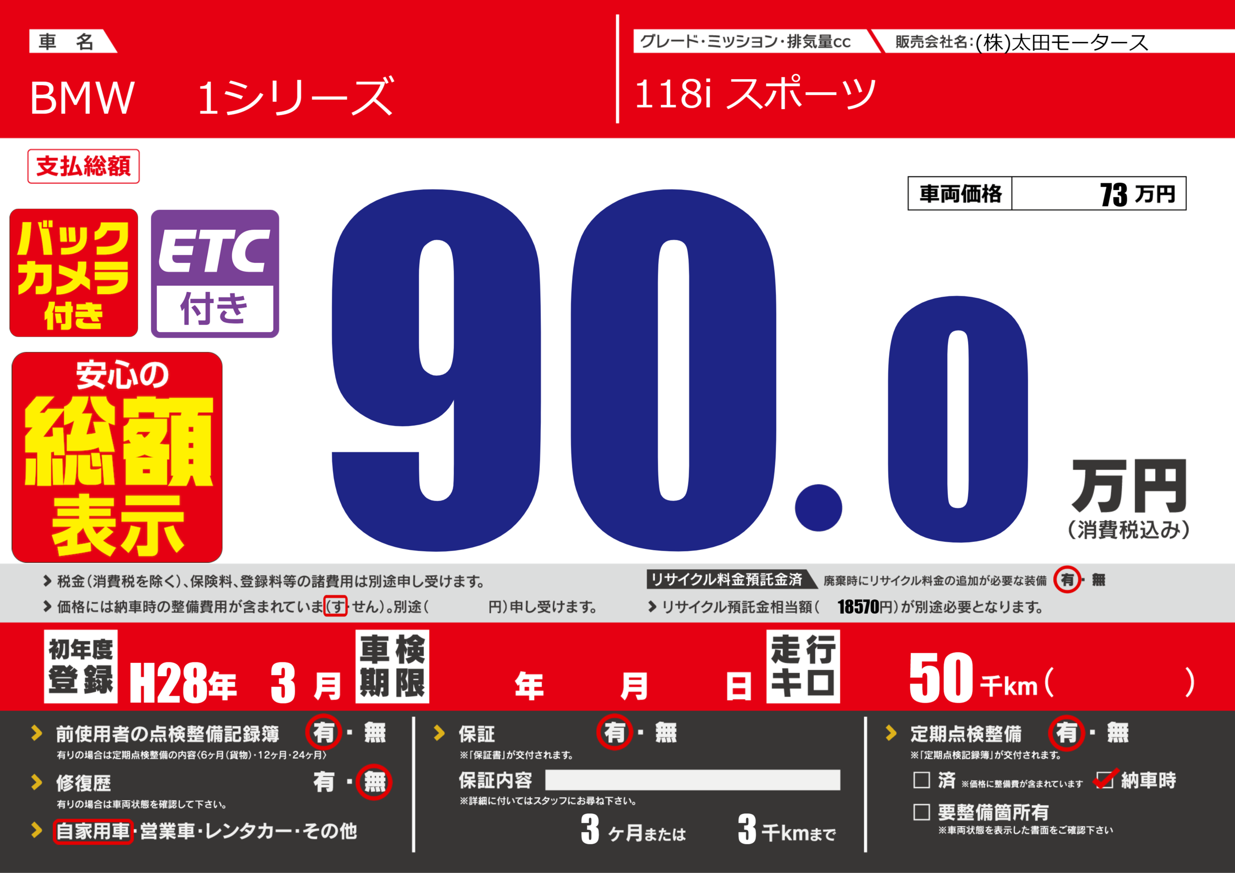 | 定期点検整備 | 定期点検整備あり 納車時あり | ||