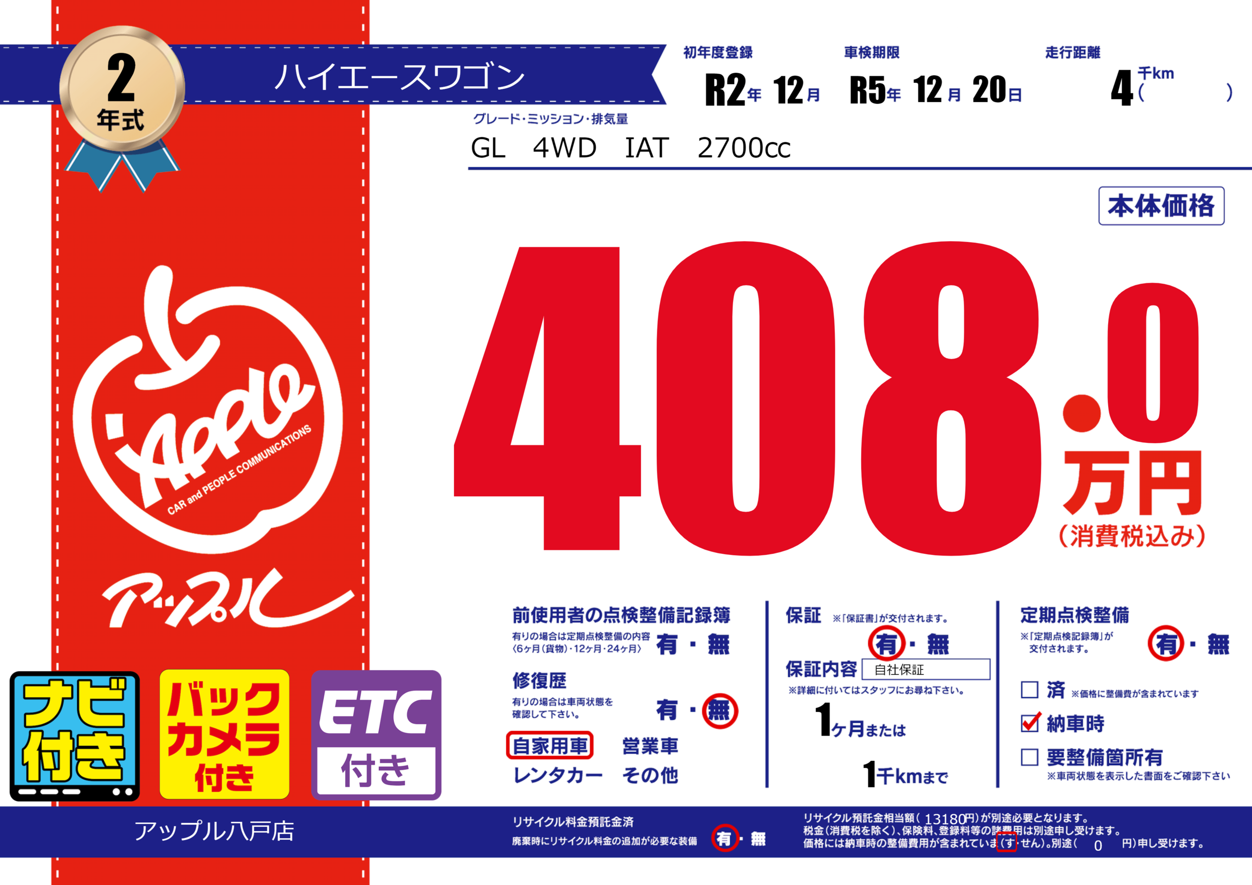 | 走行キロ | 0.4万km | 初年度登録 | R2年12月 |