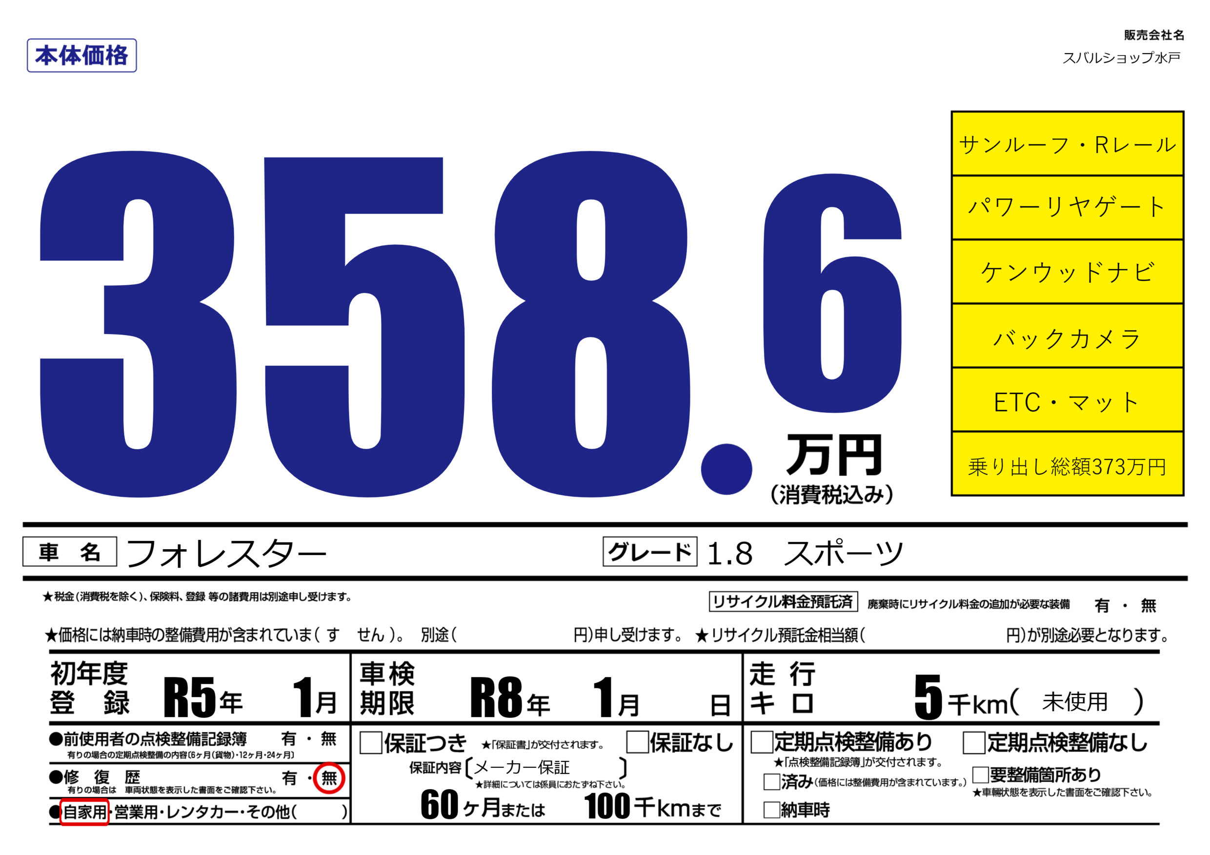 | 車名 | フォレスター | グレード ミッション 排気量 |