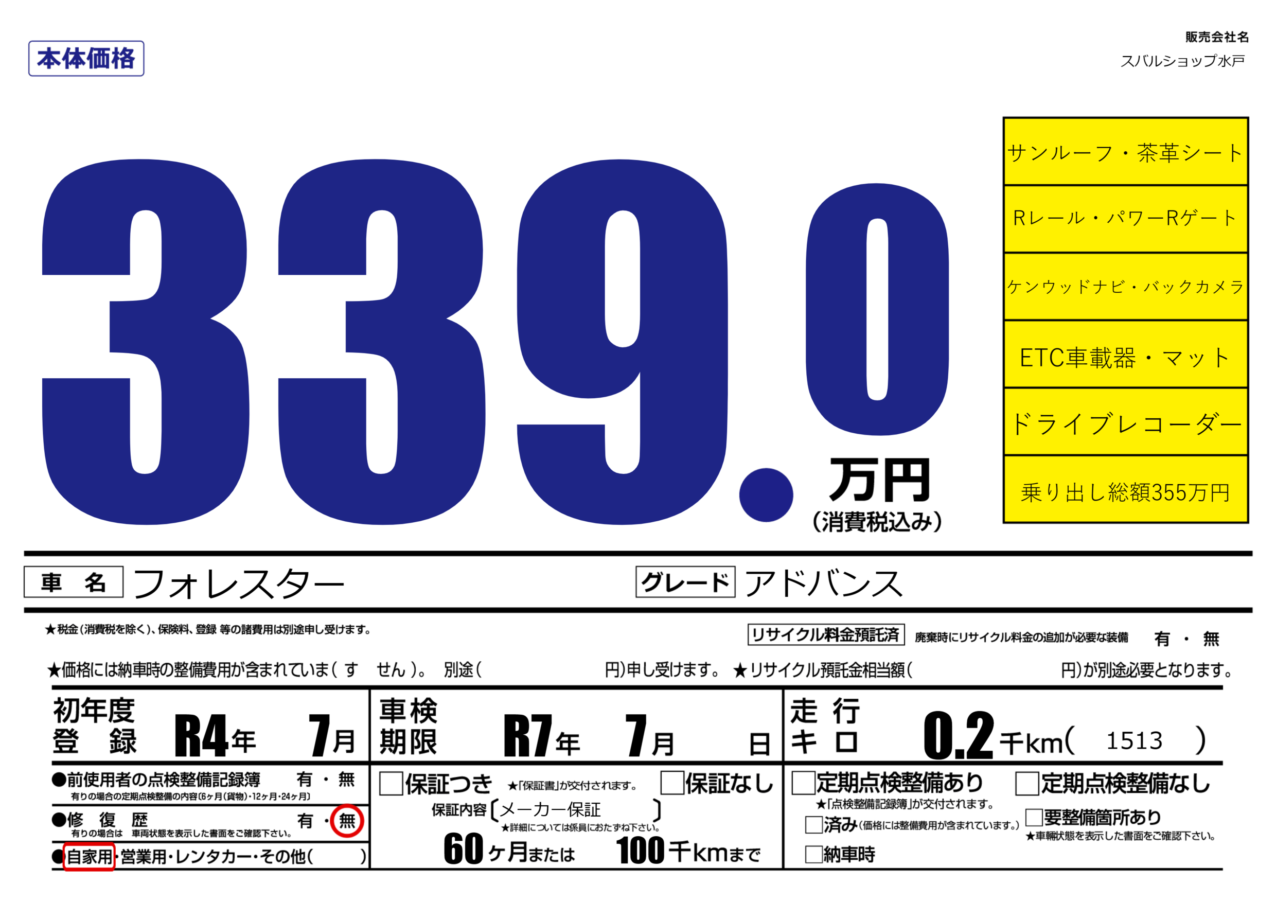 | 車名 | フォレスター | グレード ミッション 排気量 |