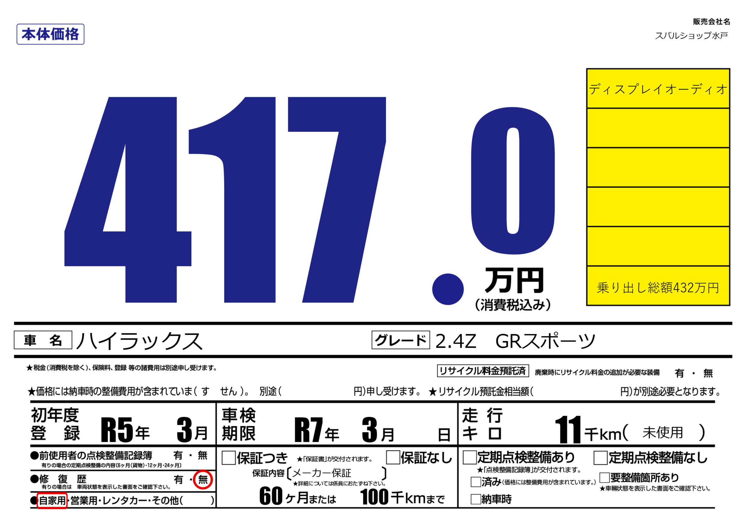 なし | 車検制限 | R7年3月---月 |