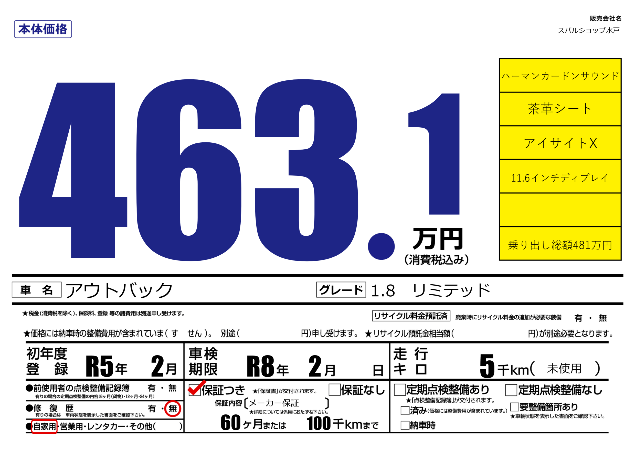 | 車名 | アウトバック | グレード ミッション 排気量 |