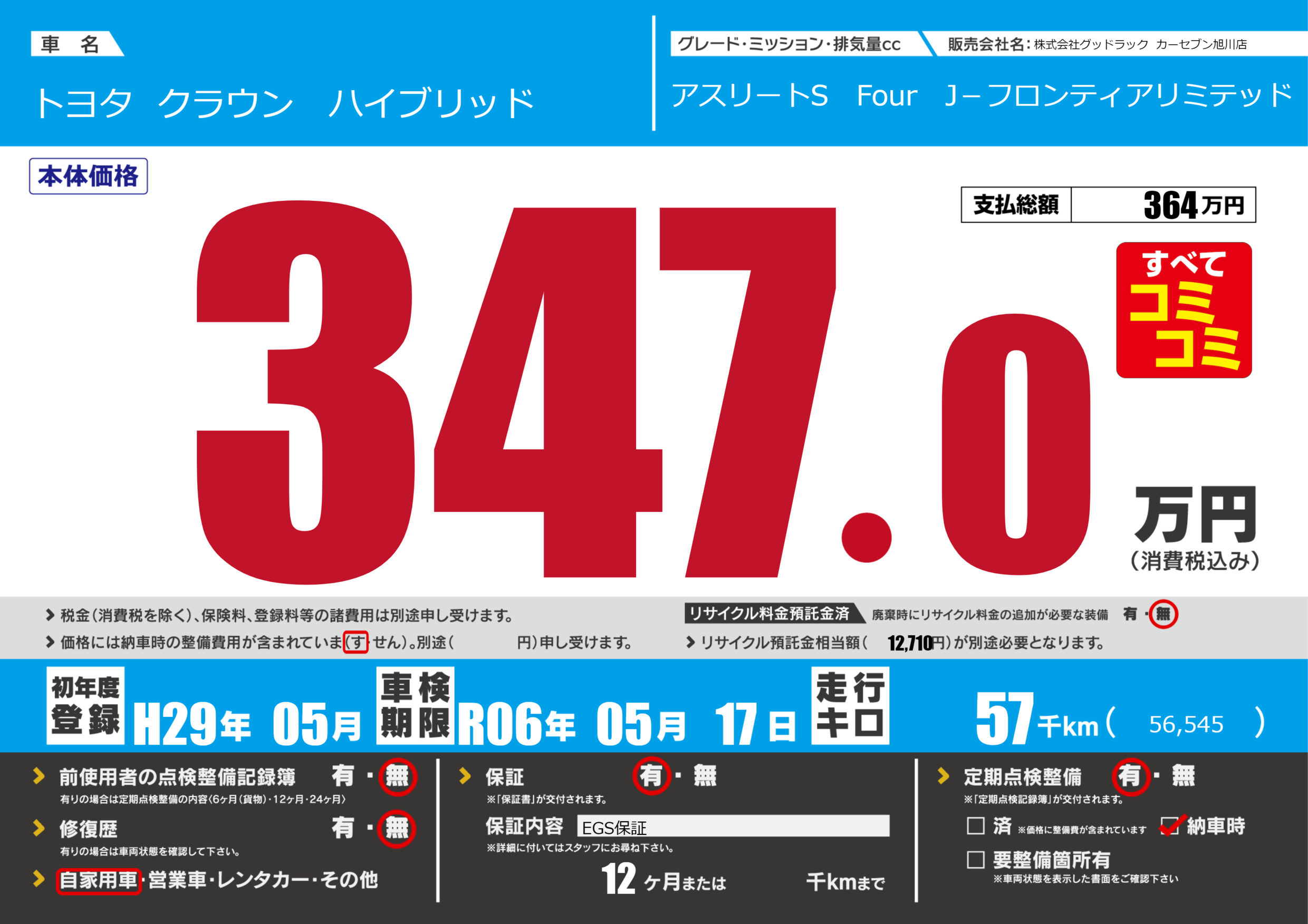 | 車名 | トヨタ クラウン ハイブリッド | グレード ミッション 排気量 |