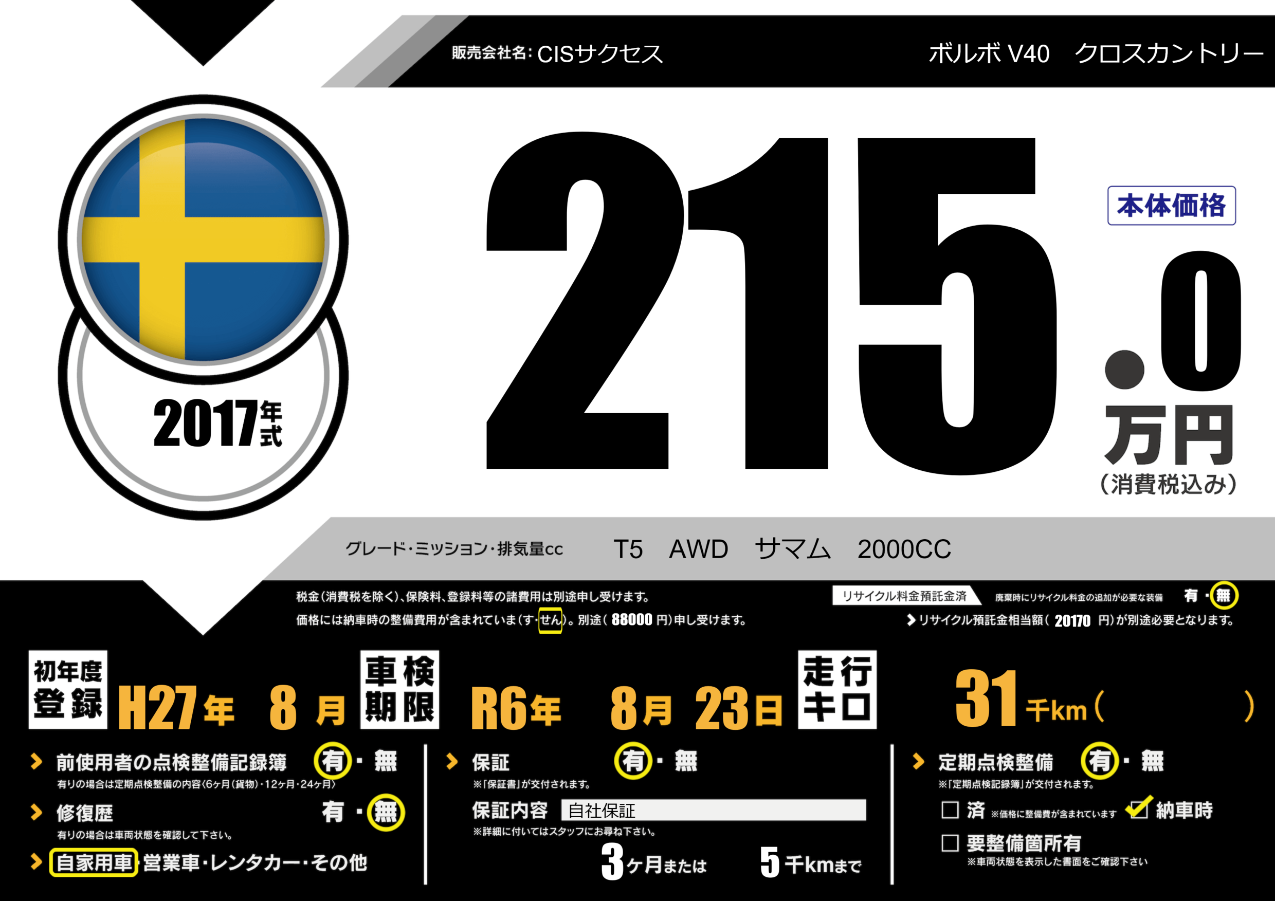| 車名 | ボルボ V40 クロスカントリー | グレード ミッション 排気量 |