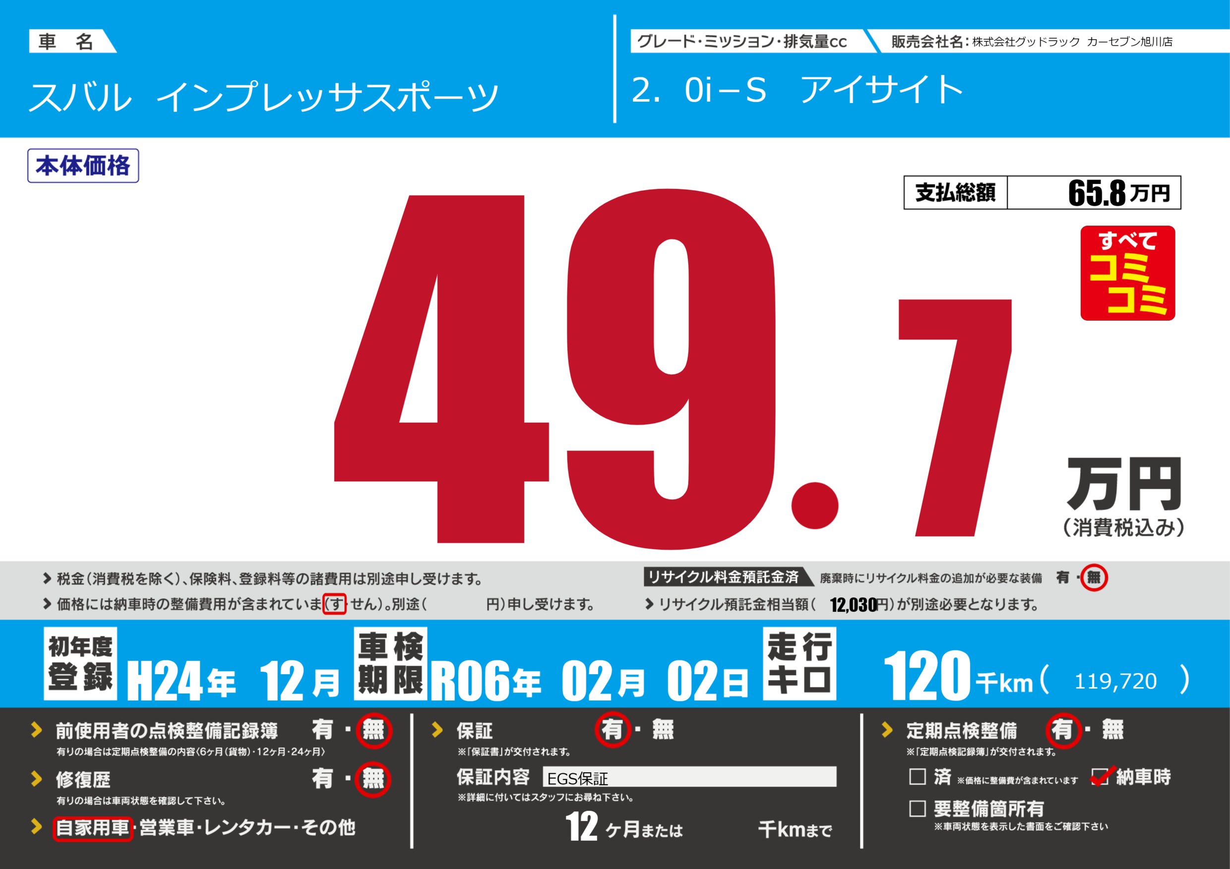 | 走行キロ | 12万km | 初年度登録 | H24年12月 |