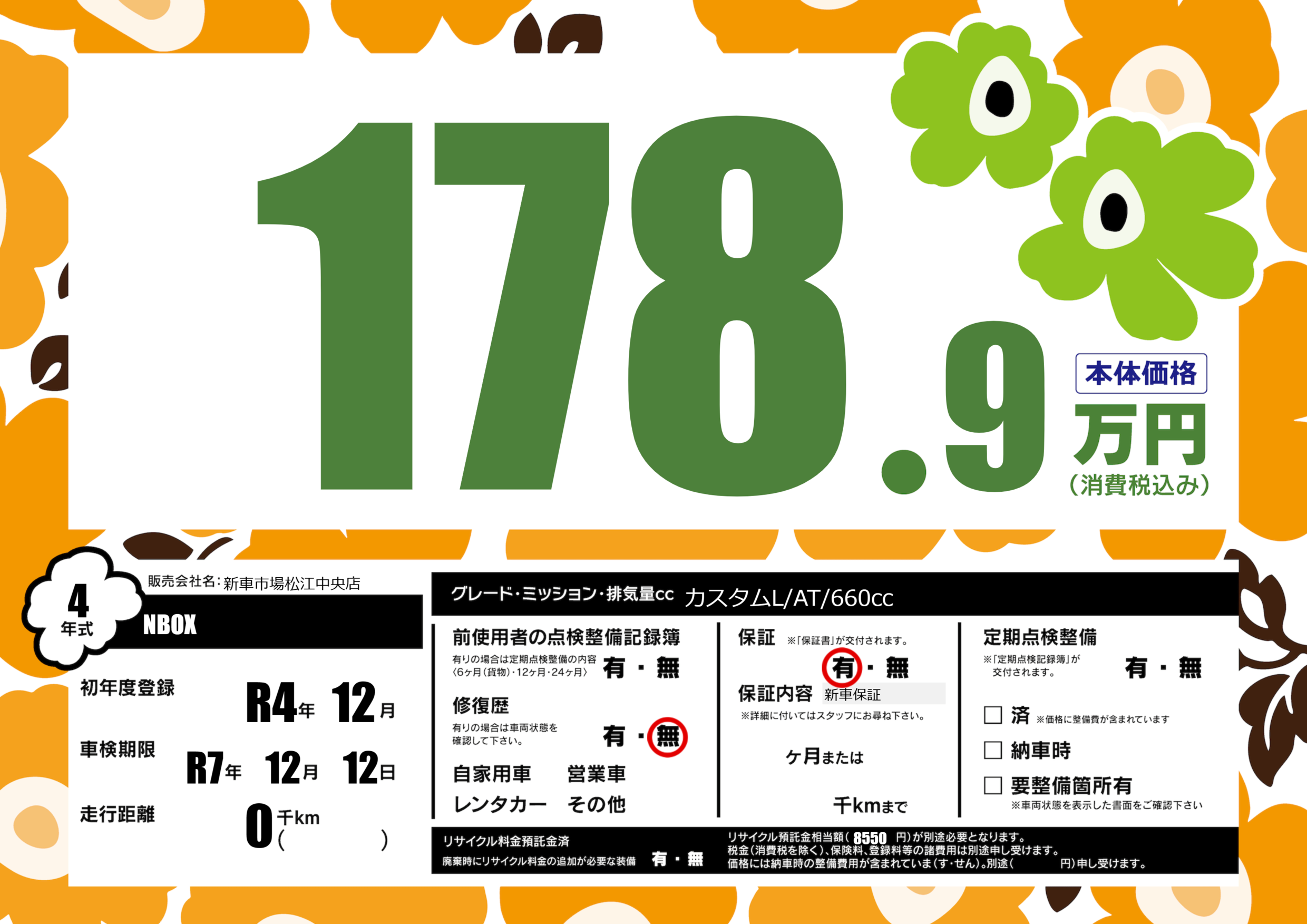 | 車名 | NBOX | グレード ミッション 排気量 |