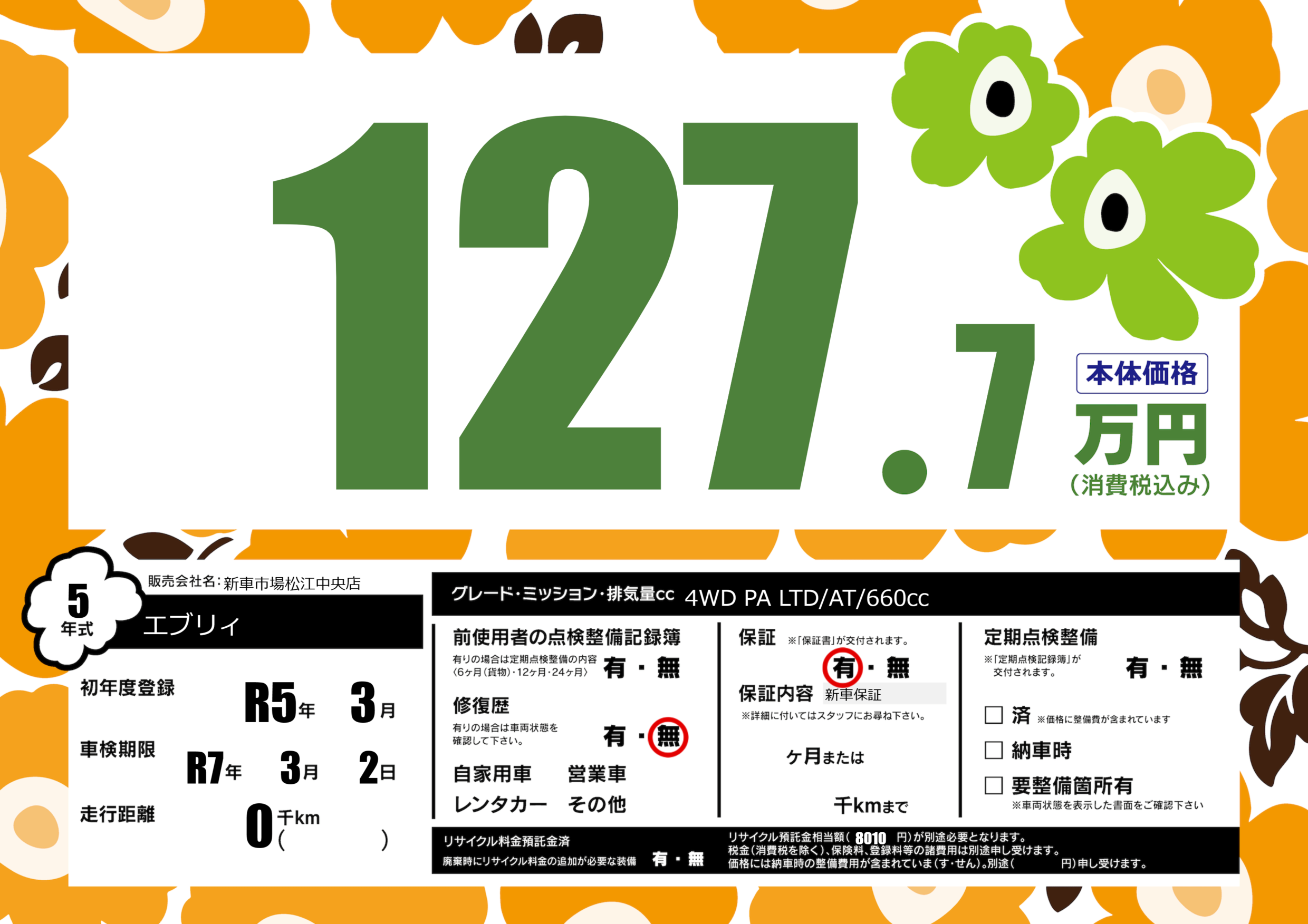 | 車名 | エブリィ | グレード ミッション 排気量 |