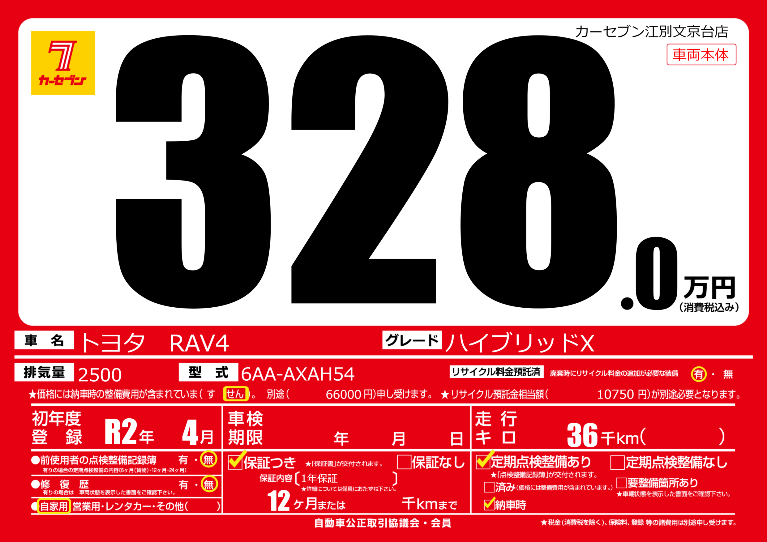 | 車名 | トヨタ RAV4 | グレード ミッション 排気量 |