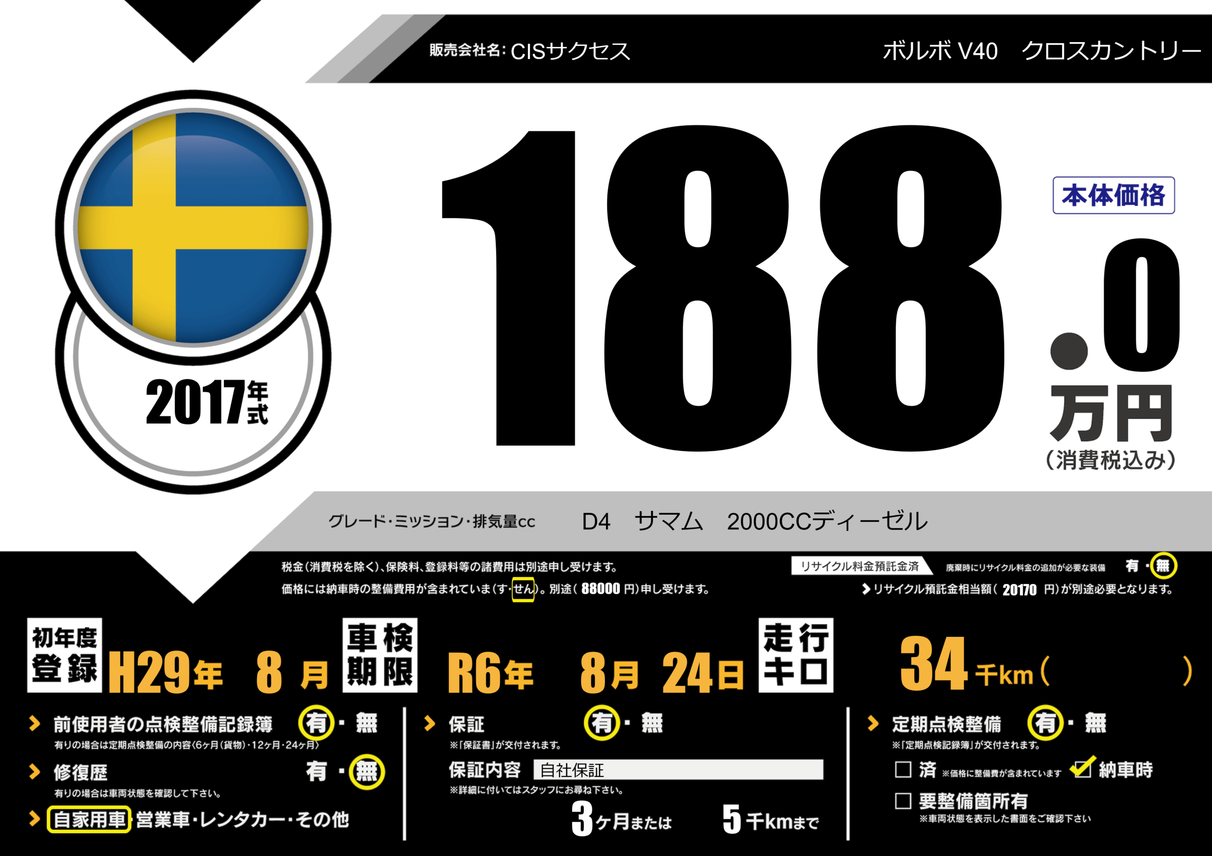 | 車名 | ボルボ V40 クロスカントリー | グレード ミッション 排気量 |