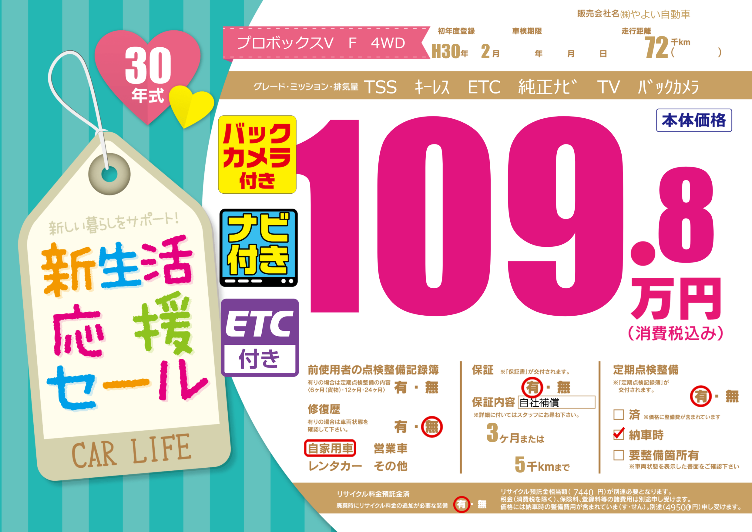 保証付き 保証内容(自社補償) 3ヶ月または(5)千kmまで |