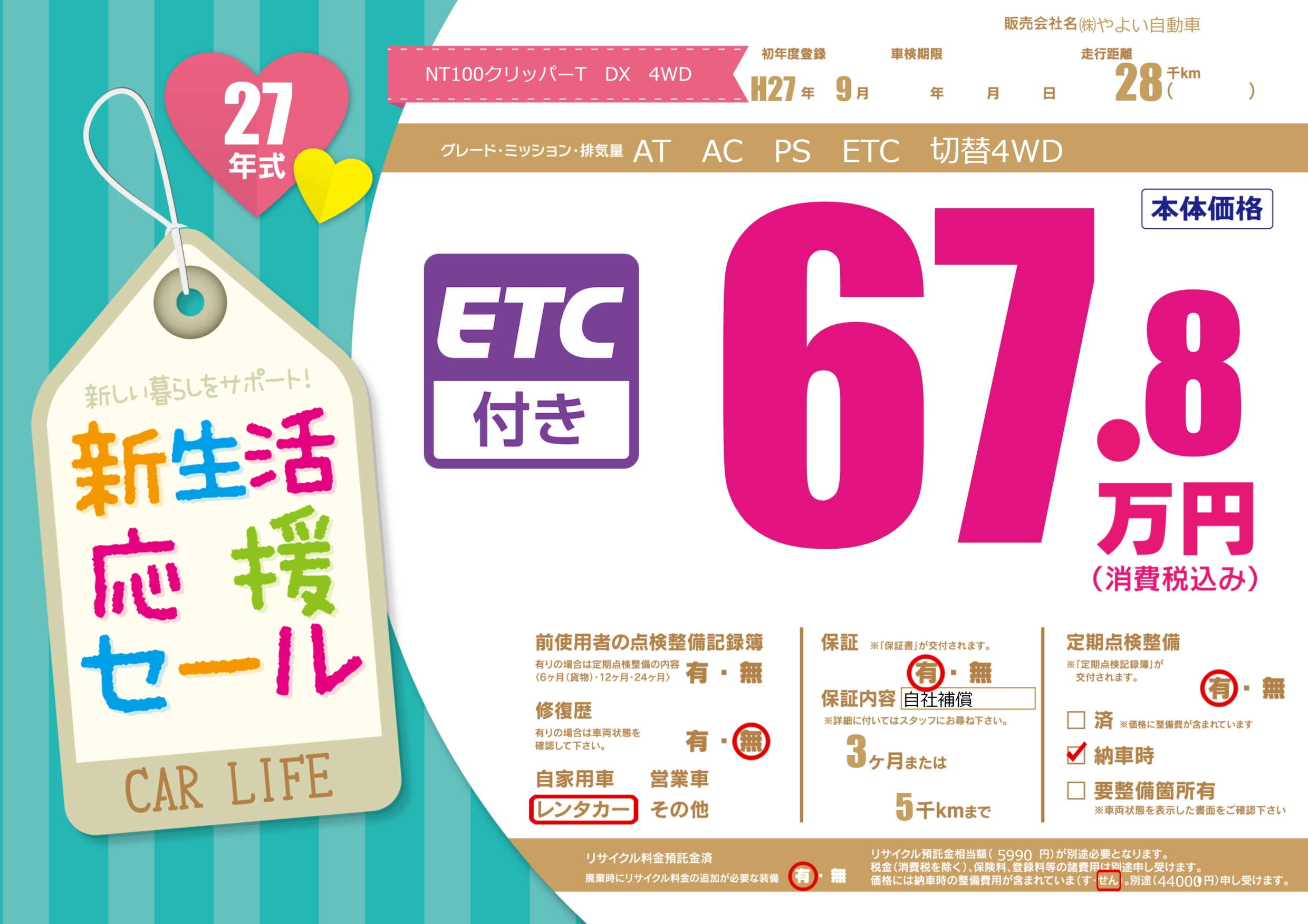 保証付き 保証内容(自社補償) 3ヶ月または(5)千kmまで |